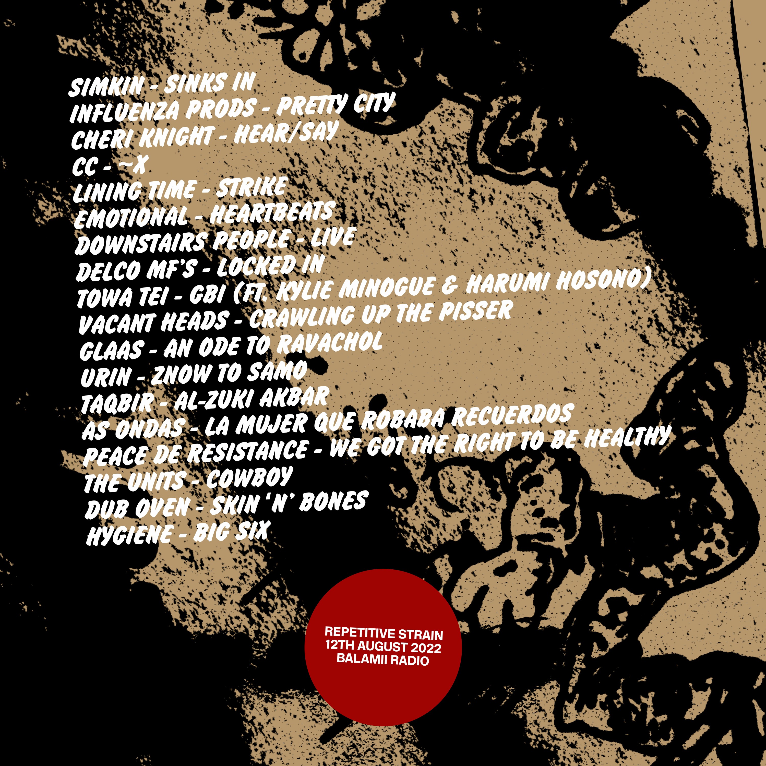 Repetitive Strain sweats it out to bring you another hour of the most wanted hardcore noize, font house and reasons to strike a light on your electric bill. With new Simkin & Cheri Knight, picks for Static Shock Weekend and co-incidental trips down a familiar basement.
