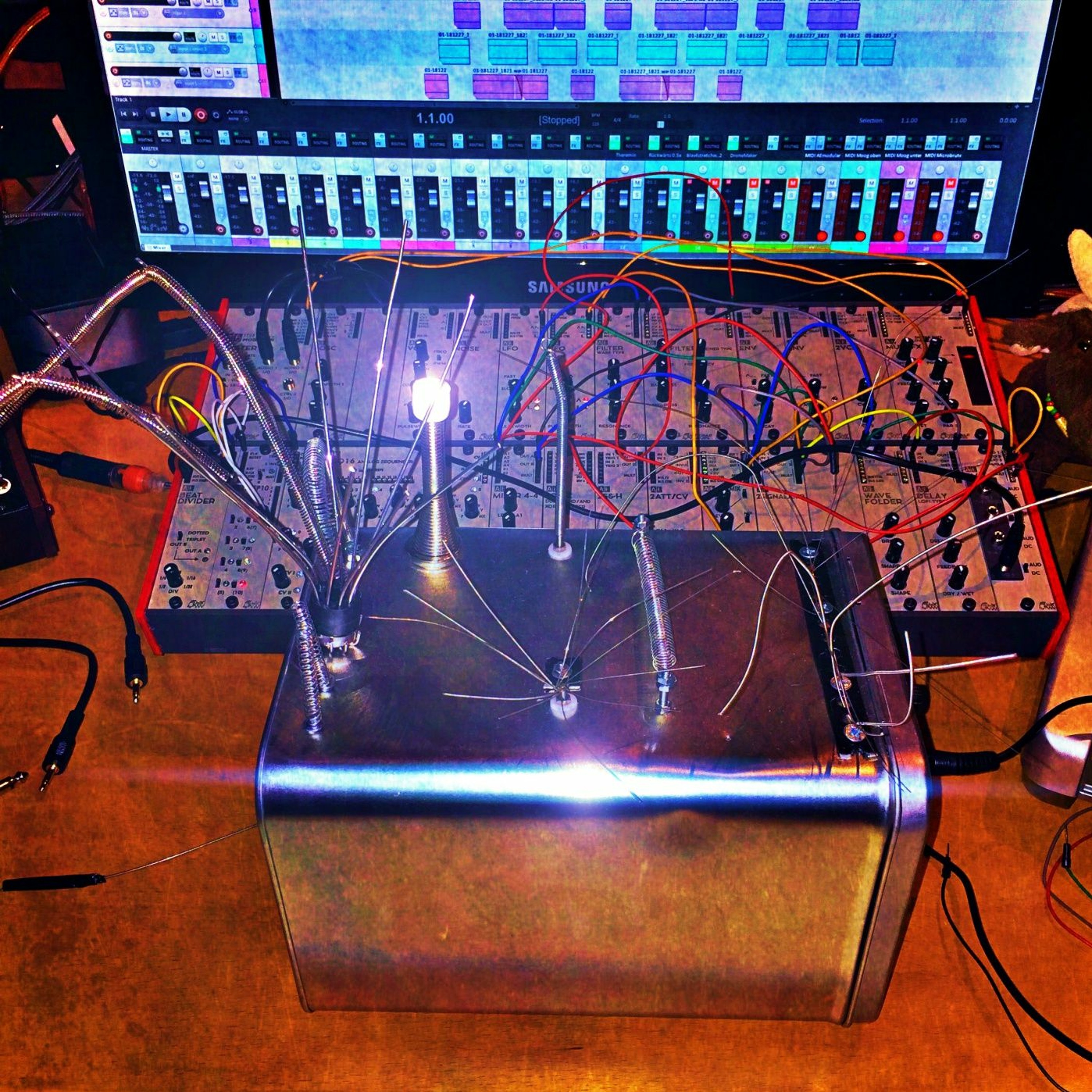 My self-built metal noisebox, the Krakenphone, sent via 4I/O and 2Signalamp into the AE modular. The audio signal went on different routes thru the modules to the mixer. Different sound have been recorded in separate takes with different settings and put together with Reaper to build this beethovenish dramaturgy …