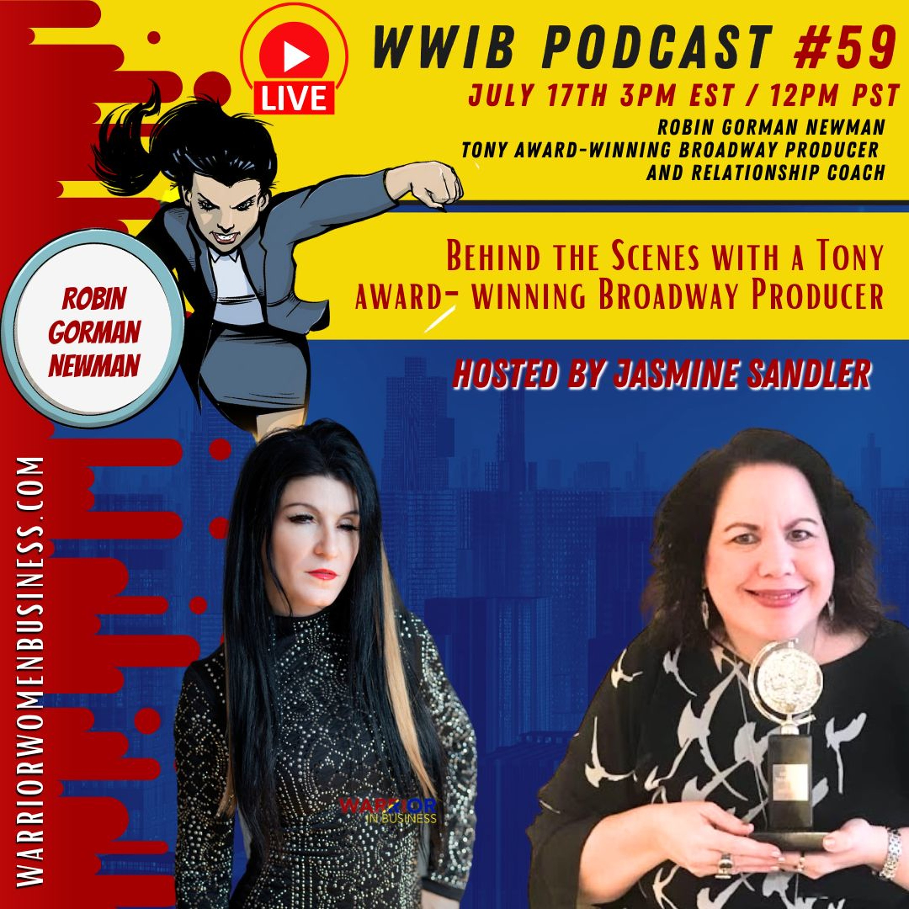 Welcome to Warrior Women in Business Podcast Episode 59 where host and lead Warrior Woman Jasmine Sandler sat down with a true Warrior Woman on Broadway, Robin Gorman Newman. Robin is a Tony-award winning Broadway Producer and has been beyond some of the biggest shows on Broadway! In this episode she shares advice on how to develop a career on Broadway and her background to success! Robin is also a well known Love Coach.