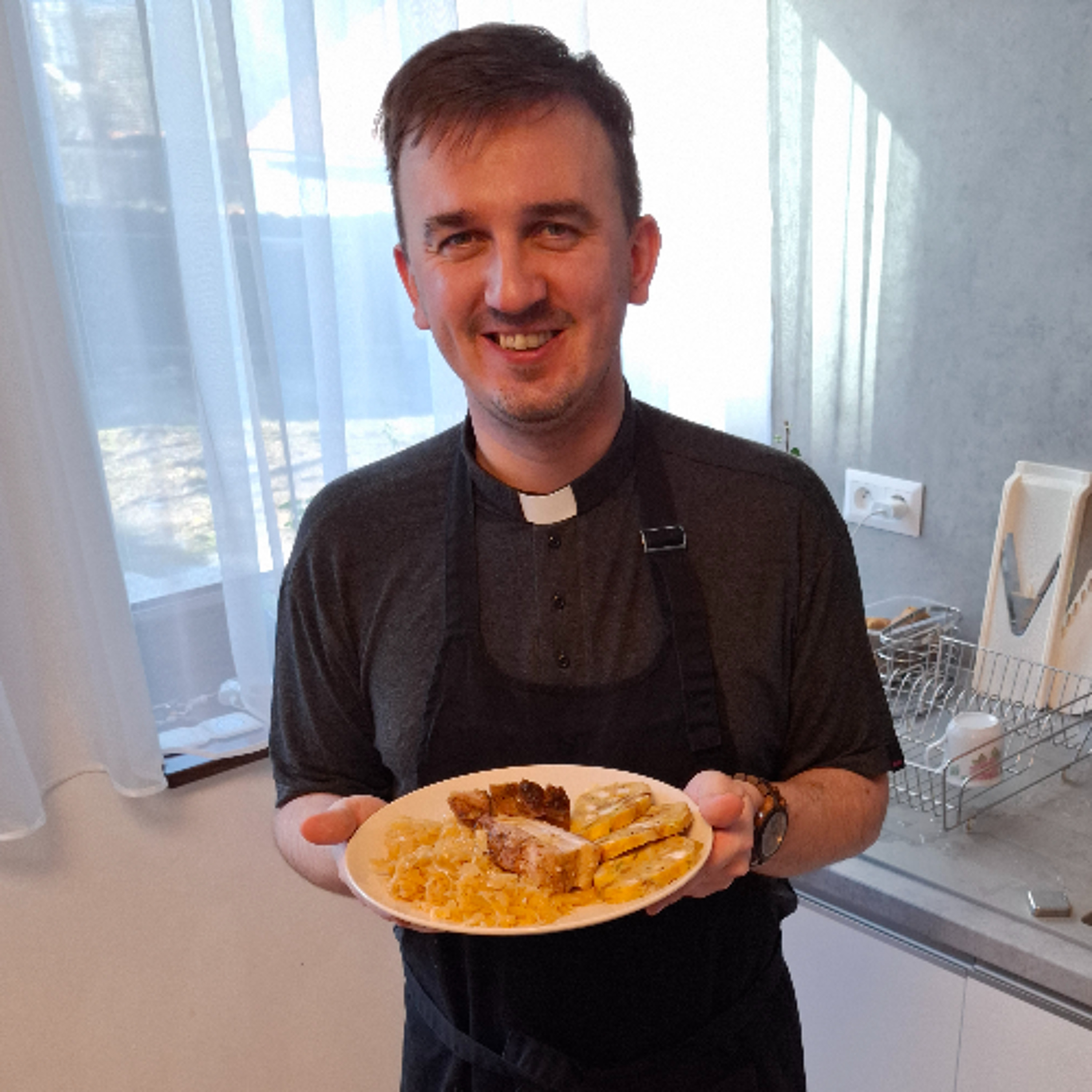 Máme pre vás recept na výdatný obed, v ktorom sa výborne doplnia chute talianskej, slovenskej i českej kuchyne. Jana Ondrejková sa vybrala na faru do Ružomberka, kde vedia výborne variť všetci kňazi. Úlohy variaceho hostiteľa sa tentoraz ujal kaplán Martin Tešla. Pripravil bôčik s kapustou, karlovarský knedlík a paradajkovú krémovú polievku.