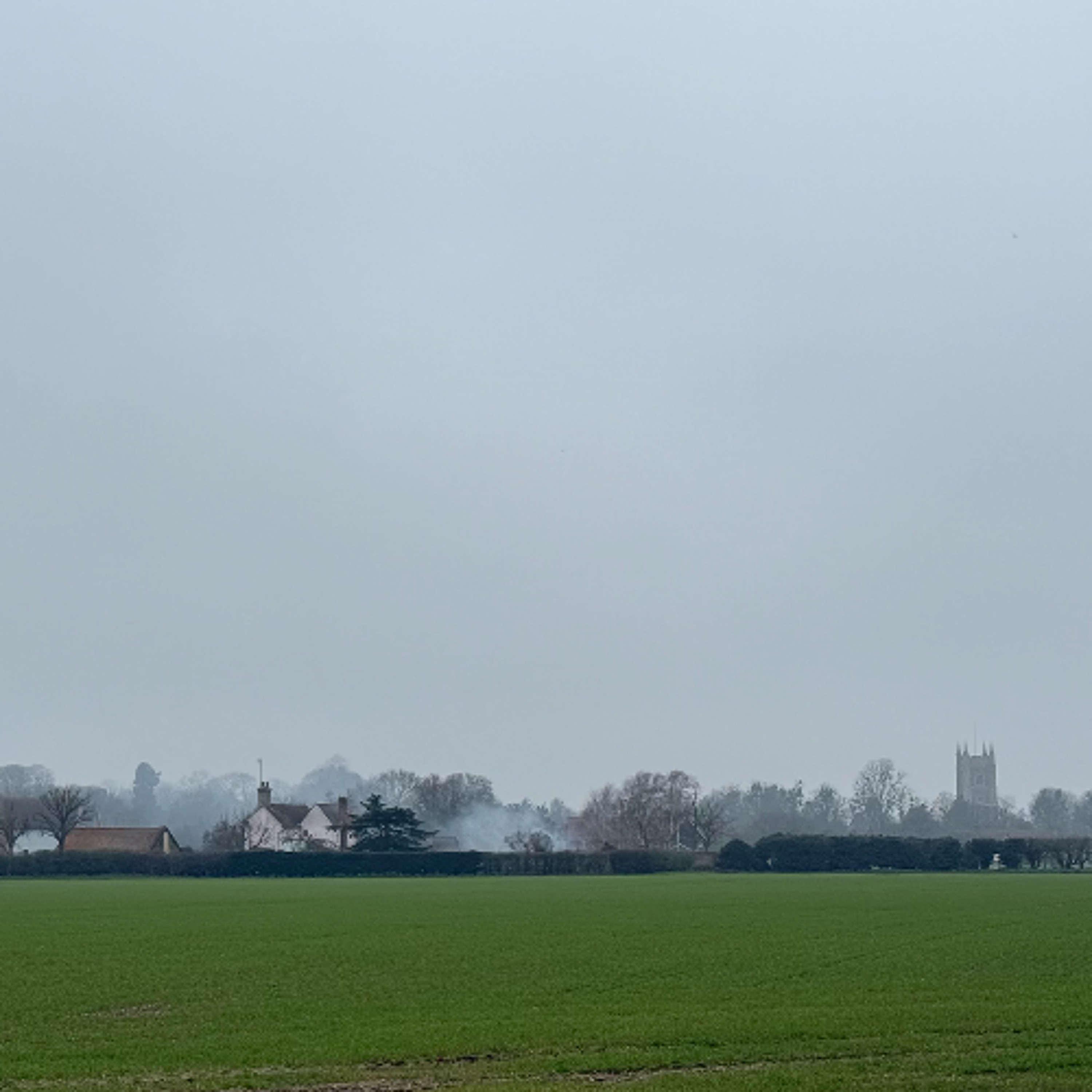 There is some smoke rising from near to Dedham Church, the village is about a mile away, visible through the mist, the clomp of two pairs of wellies, the sky a blanket of grey as it was yesterday, a skylark somewhere up in the gloom, a flotilla of gulls navigating the space occupied by a circling buzzard but leaving it well alone, trial bikes tear-arsing around somewhere nearby, a distant train, the footsteps of a mother and daughter, Blue Tit and jet compete for attention but their differing frequencies mean there is room for both, a flock of geese.