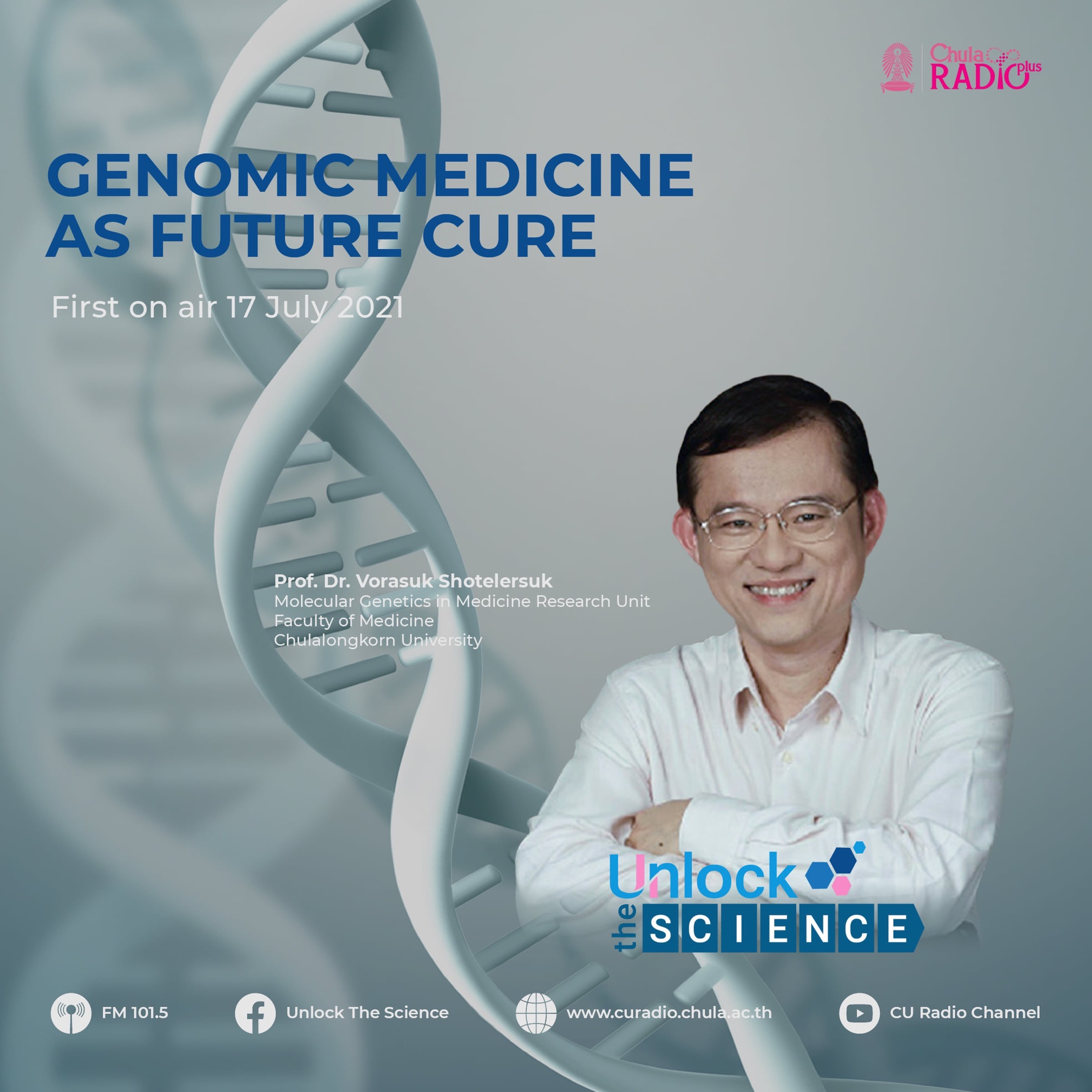 Genomic medicine is a new revolutionary medical trend, which – according to researchers - is going to fundamentally change the ways conventional medicine diagnoses and treats patients. It is an emerging medical discipline that involves using genomic information of an individual person as part of their clinical care, which includes diagnosing the sickness and selecting choices of medical treatment. As each individual person has his own unique genes and genetic traits, these traits are closely linked with the state of our health. This medical technology is also being applied to treat rare diseases. Currently, there are over 6,000 known rare diseases, and 8 in 10 of these rare diseases are linked to a genetic cause. The serious disease that led to gradual paralyzing of the entire body that Stephen Hawking, the renowned theoretical physicist, suffered and died of later is one prominent example of rare genetic diseases. The disease is amyotrophic lateral sclerosis, or ALS, or commonly referred to in the United States as Lou Gehrig's disease. In this episode, Prof.Dr.Vorasuk Shotelersuk, head of the Molecular Genetics in Medicine Research Unit, Faculty of Medicine, Chulalongkorn University, explains what genomic medicine is and its application to treat rare genetic diseases.