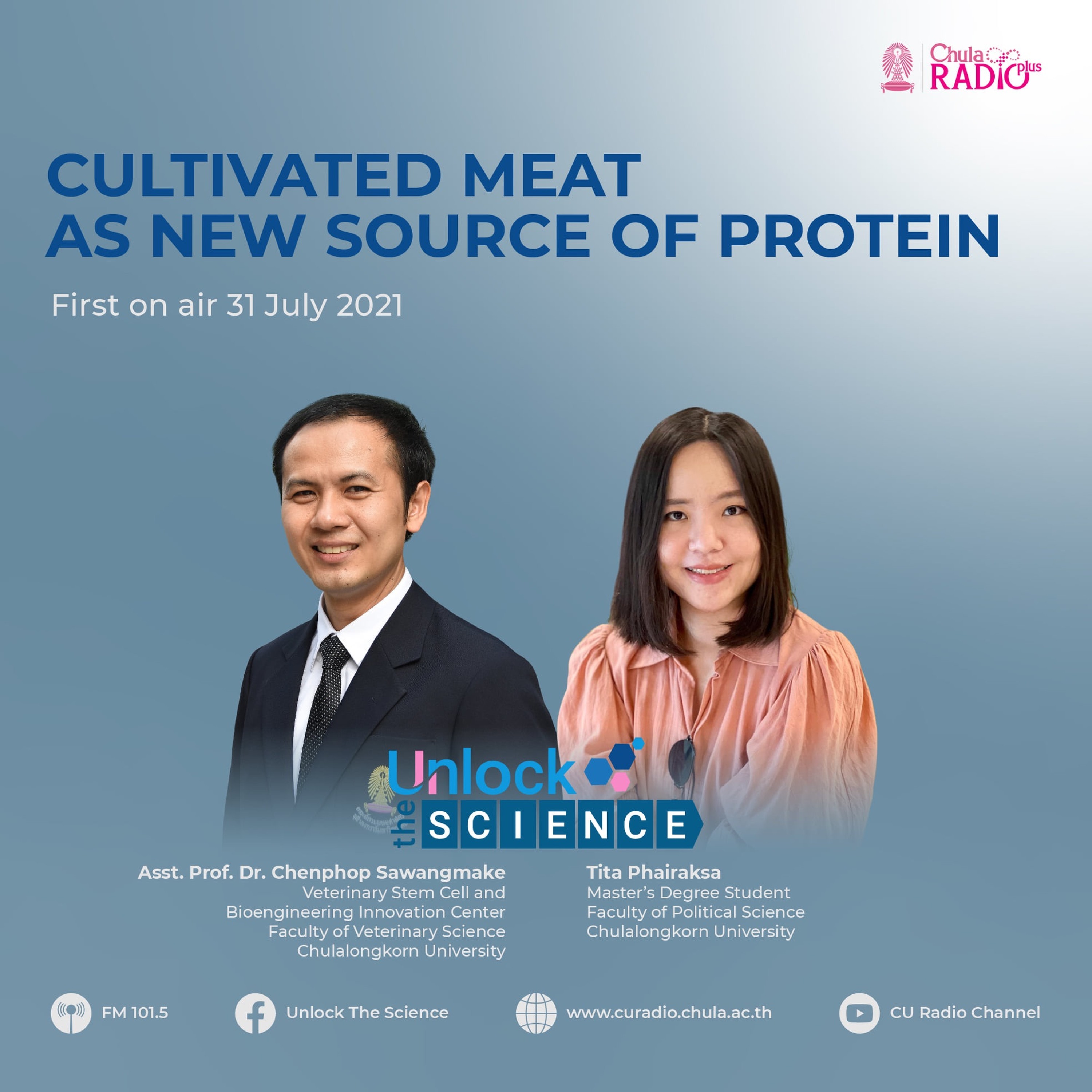 Meat is an integral part of human’s diet since before the beginning of history, as our primitive ancestors made their living by hunting wild animals for protein. But meat industry has caused many environmental and health problems, including deforestation, water and air pollution, climate change, and even rising risk of new zoonotic diseases. Data shows that beef industry alone was responsible for 41 percent of global deforestation. Therefore, there have been efforts to produce protein from plants. In this episode, Unlock The Science discusses a new technology of producing meat without having to farm and slaughter whole animals. Cultivated meat is made using a small amount of animal cells and growing them in a nutrient-rich medium inside an incubator, where they multiply rapidly. Joining the discussion are Tita Phairaksa, a master’s degree student at Faculty of Political Science, Chulalongkorn University, who is an active vegan activist, and Asst. Prof. Dr. Chenphop Sawangmake, head of Veterinary Stem Cell and Bioengineering Innovation Center, Faculty of Veterinary Science, Chulalongkorn University.