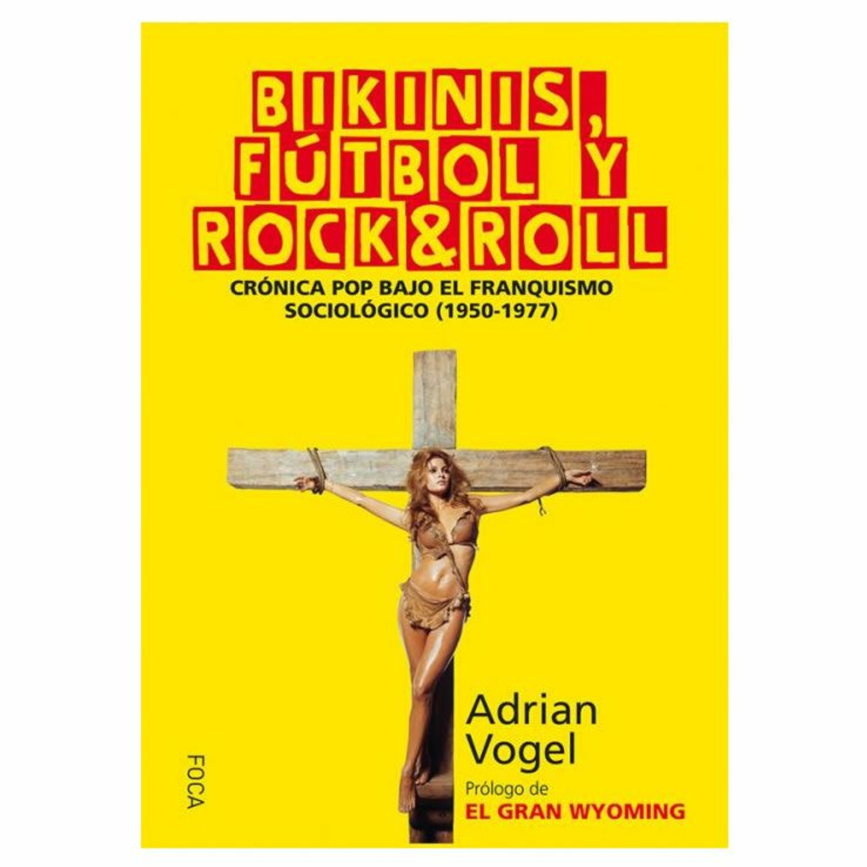 Libro con la portada de color amarillo, foto de Raquel Welch, su título 'Bikinis, fútbol y rock and roll. Crónica pop bajo el franquismo sociológico (1950-1977)El Gran Wyoming escribe en el prólogo "Esta es la crónica de aquellos años que cambiaron el mundo demostrando que, como llevan diciendo desde hace siglos los profetas, son las pequeñas personas , con pequeños gestos, quienes generan los cataclismos "