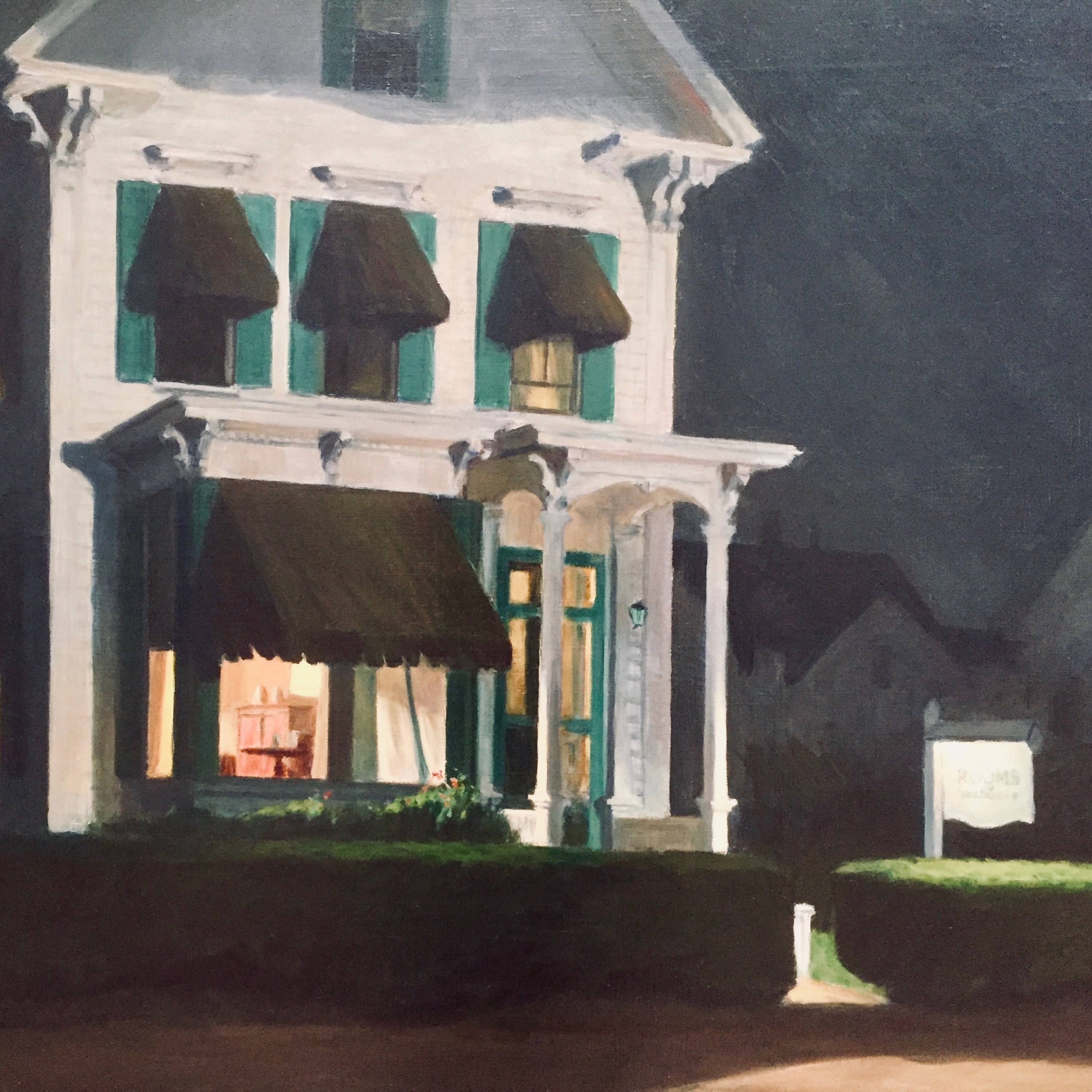 The cover art is a cropped photo of a 1945 oil-on-canvas painting by Edward Hopper titled, "Room for Tourists", which is on display at the Yale University Art Gallery in New Haven, CT.