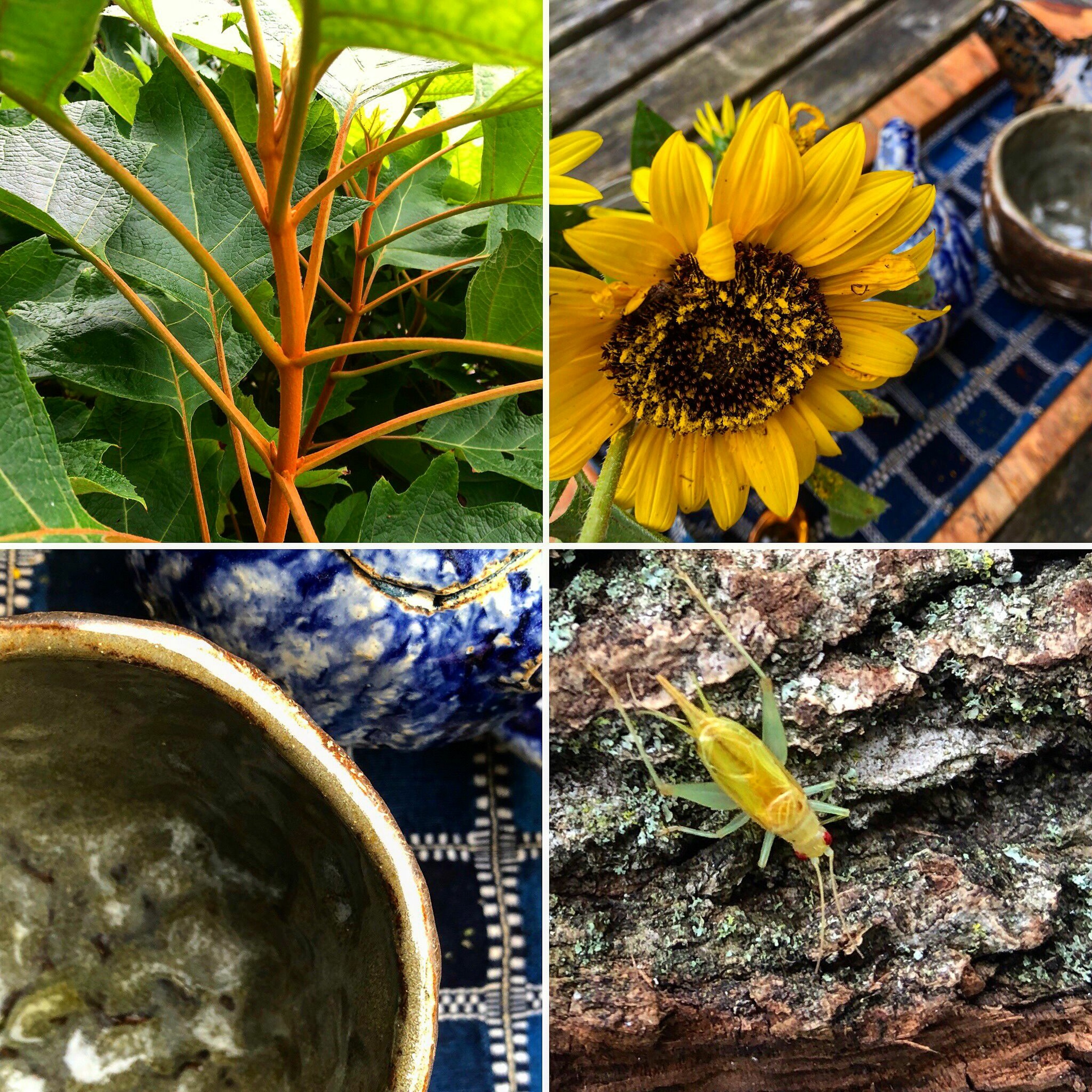 Bright yellow pollen on my shirt and scarf from the sunflowers in my vase, a pale bug with red eyes on a ragged, lichen covered piece of bark next to my tea tray. The new growth on the oakleaf hydrangea is a beautiful color I can’t describe. Sipped my sencha and listened to the crickets, power tools, and wind in the leaves on this cool gray morning.
