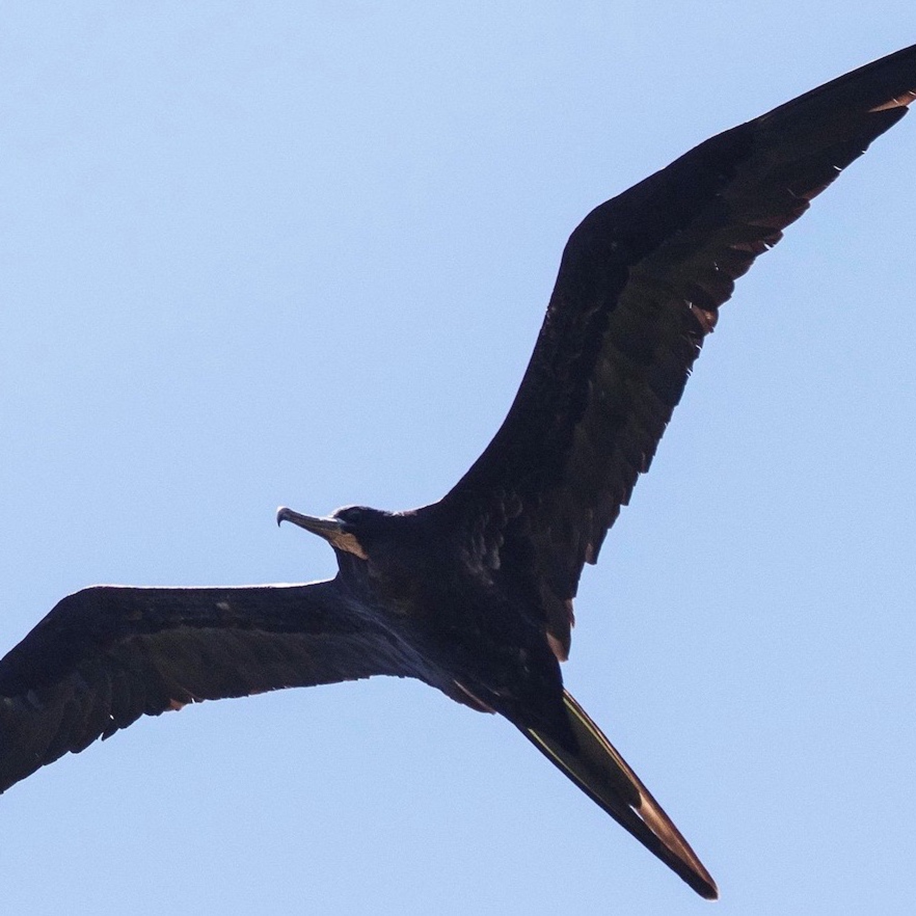 A large black seabird that holds its wings in a distinctive crook. The long, forked tail may appear pointed when folded. Males are all black with a red throat pouch. Females have a white breast. Immatures have a white head and breast. All-dark plumage of male and lack of a pale “armpit” in female and immature separate this species from Lesser and Christmas Island Frigatebirds. Separation from Magnificent Frigatebird can be difficult; note pale wing panel in males and indistinct pale throat in females (Magnificent females have a clean all-dark head). Nests in trees and bushes on tropical islands. Often seen flying along the shoreline, sometimes very high, and sometimes inland. Chases other seabirds to steal their prey. Source: eBird.