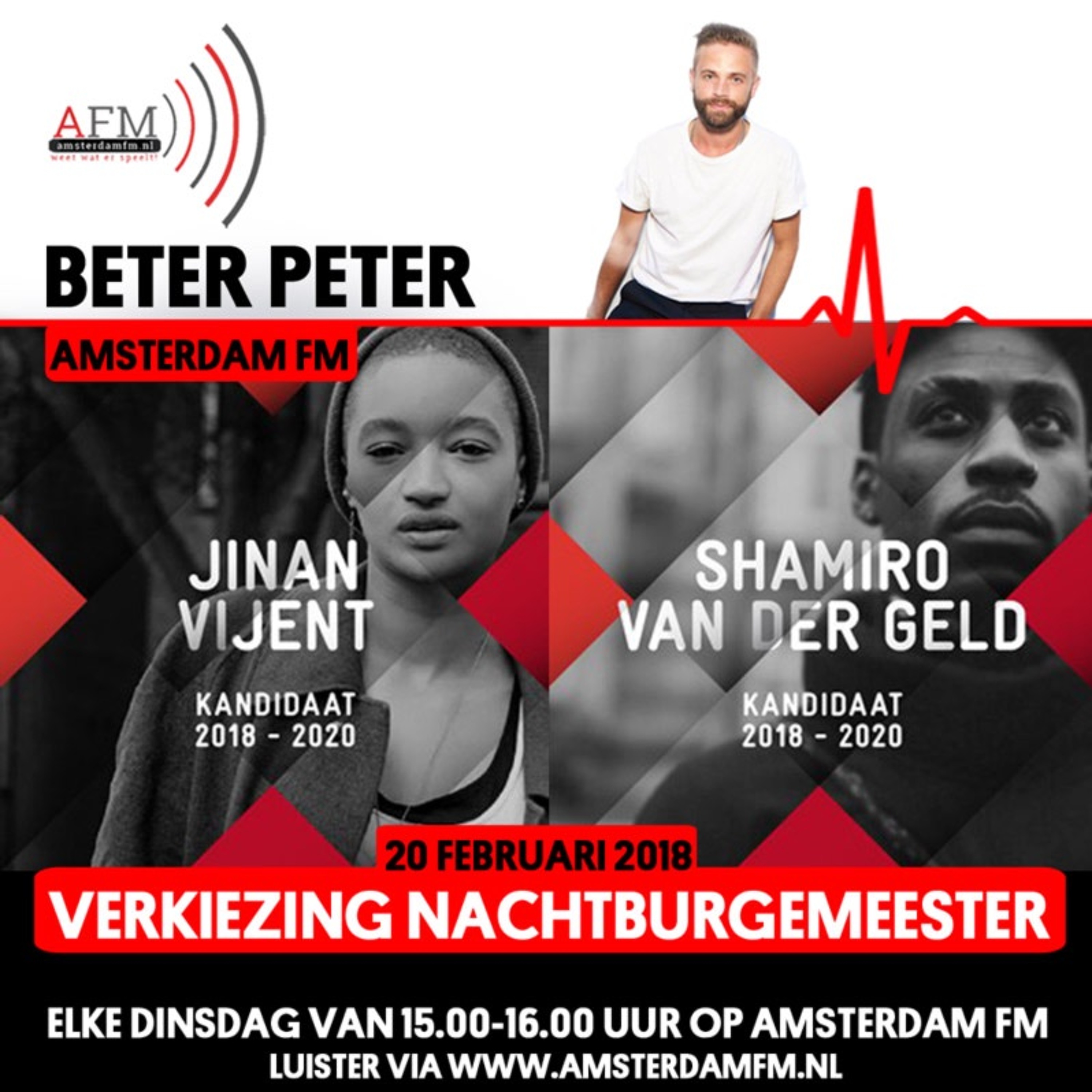 Presentator Peter van Vught interviewt twee kanshebbers op de titel Nachtburgemeester Amsterdam; Jinan Vyent en Shamiro van der Geld in zijn wekelijkse radioshow 'Beter Peter' (elke dinsdag van 15.00-16.00 uur) op AmsterdamFM.