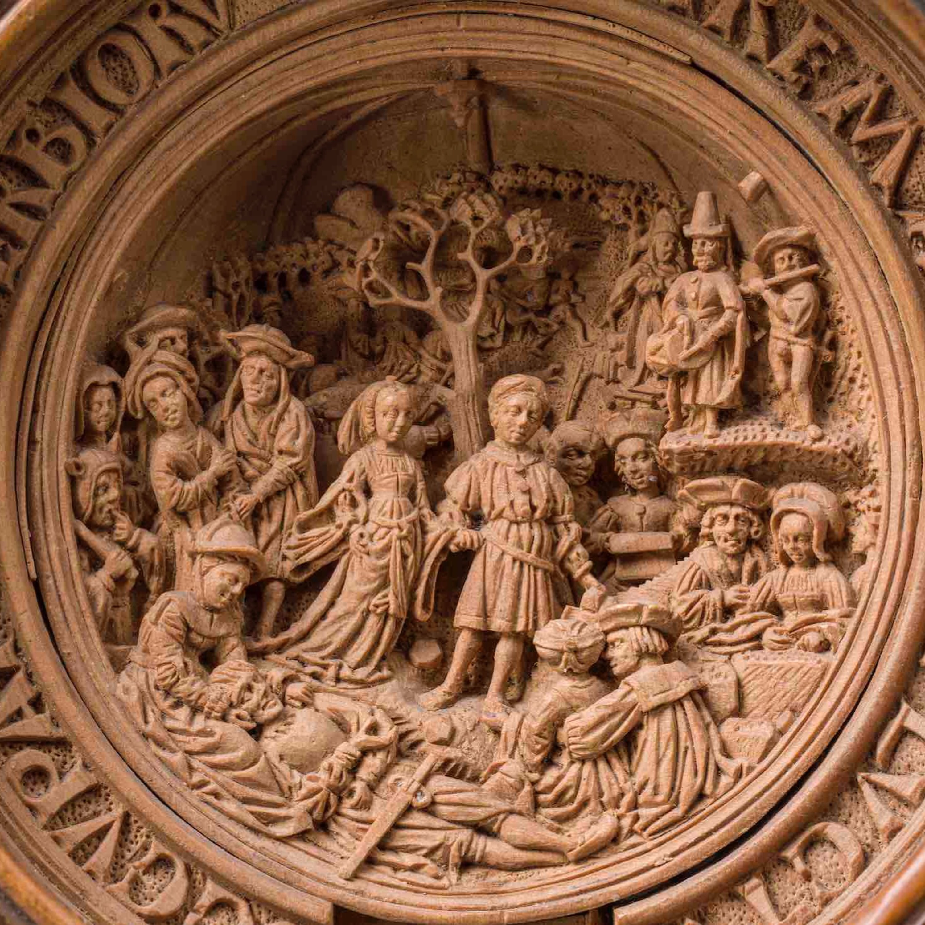 Foto: De dans van Maria Magdalena, centrale afbeelding in de onderste helft van een z.g. gebedsnoot van Adam Dirksz (en atelier) , ca.1519-30. buxushout, diameter 65mm, collectie Abegg-Stiftung, Riggisberg Zwitserland.