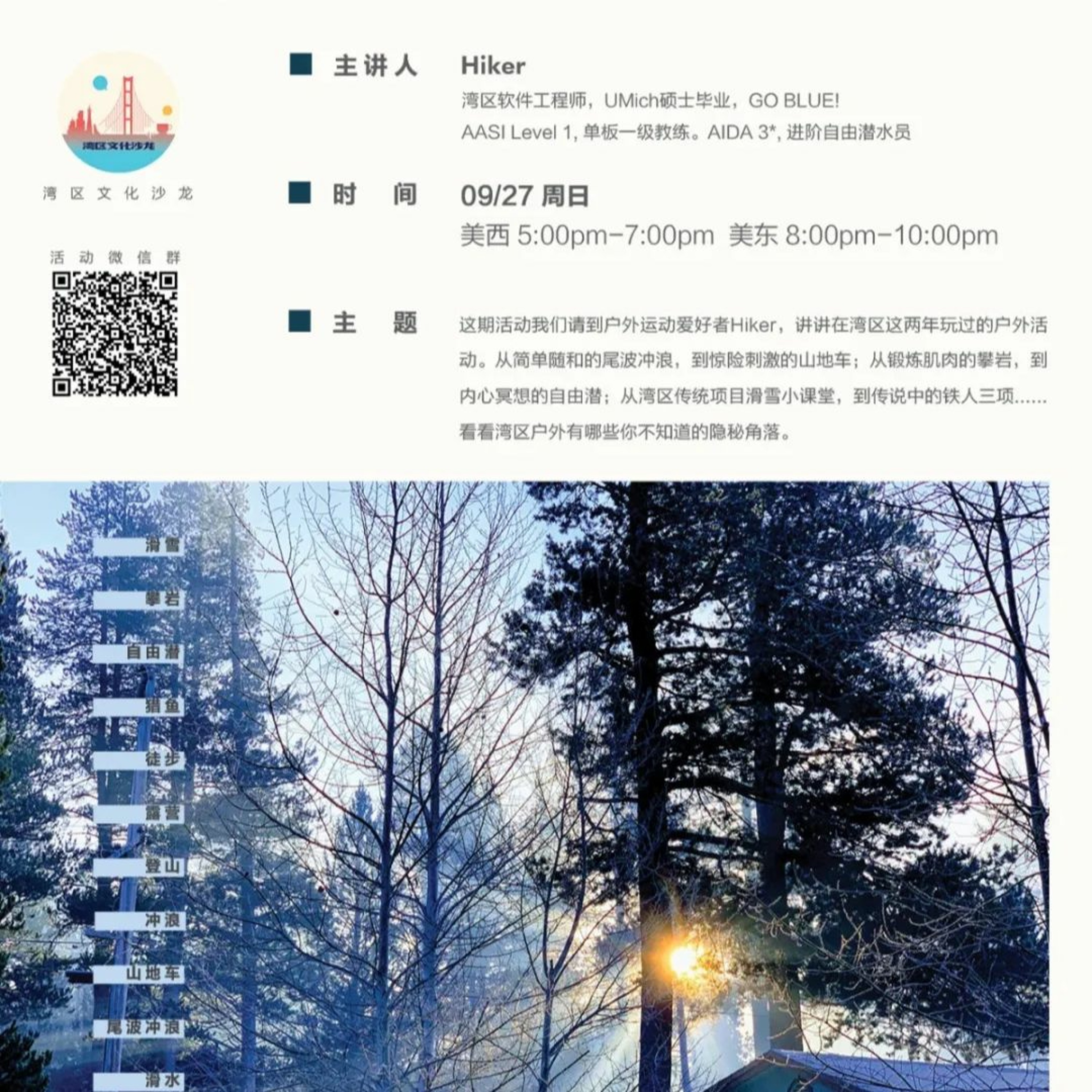 这期活动我们请到户外运动爱好者Hiker,讲讲在湾区这两年玩过的户外活动。从简单随和的尾波冲浪,到惊险刺激的山地车;从锻炼肌肉的攀岩,到内心冥想的自由潜;从湾区传统项目滑雪小课堂,到传说中的铁人三项......看看湾区户外有哪些你不知道的隐秘角落。