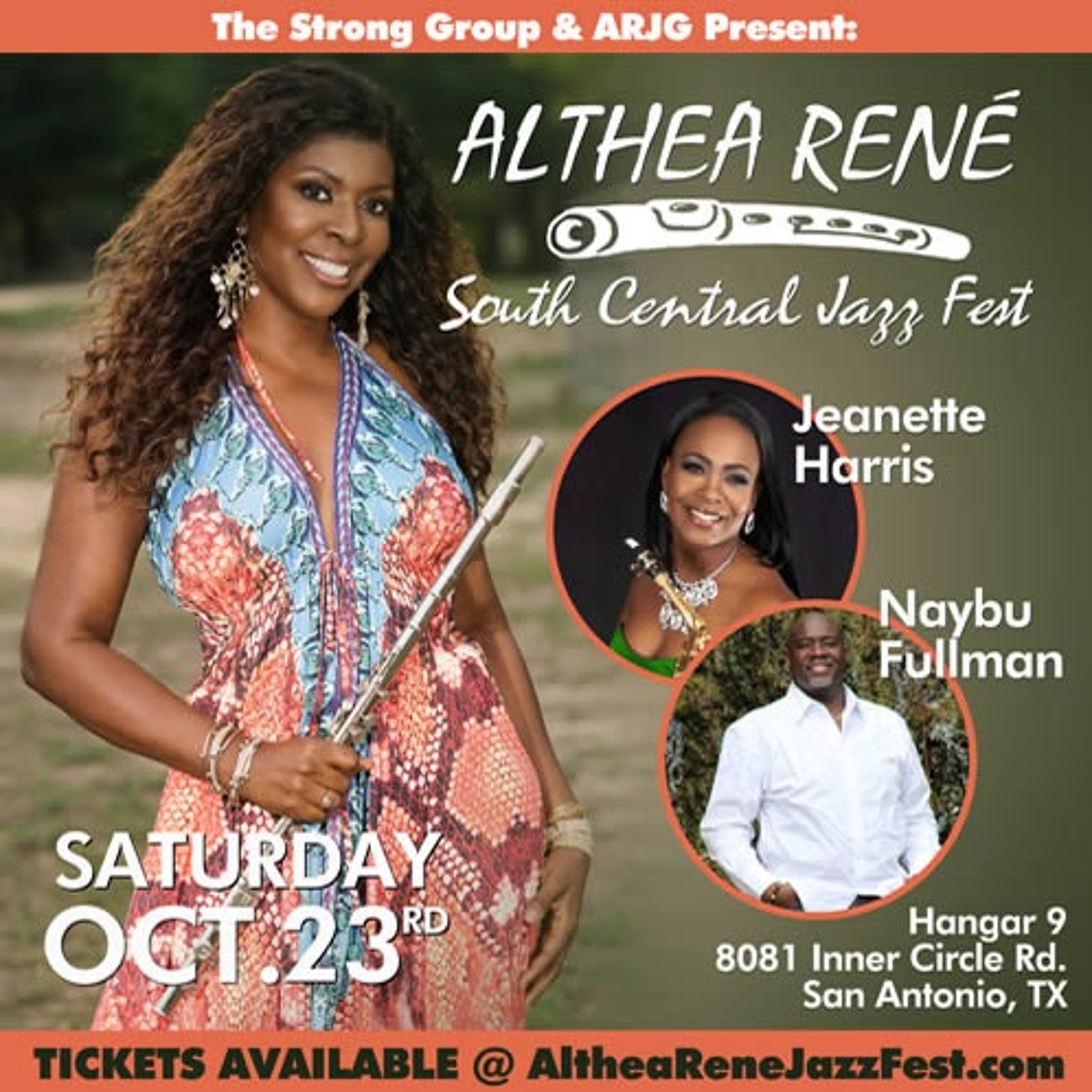 A.R.J.G. and The Strong Group present South Central Jazz Fest in San Antonio, Texas on Saturday, October 23, 2021 featuring Soul-Jazz Flutist ALTHEA RENE, Saxtress JEANETTE HARRIS, and vocalist NAYBU FULLMAN at historic Hangar 9. Tix @ www.altherenejazzfest.com