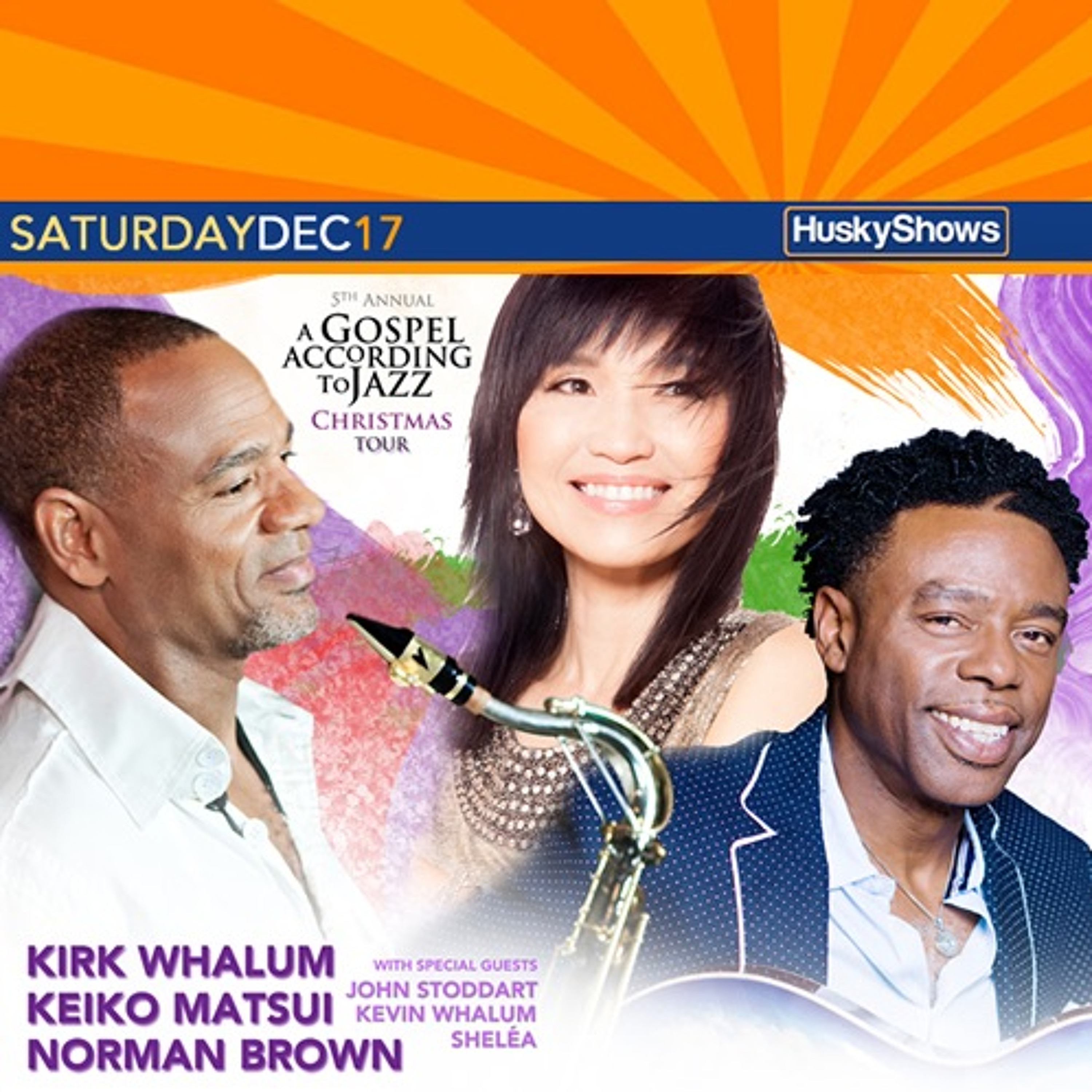 HuskyShows, the premier concert production company in Sacramento, California, presents A GOSPEL ACCORDING TO JAZZ Christmas Tour featuring Kirk Whalum, Keiko Matsui and Norman Brown on Saturday, December 17th, sponsored by SmoothJazz.com Global. Tix & Info : www.HuskyShows.com