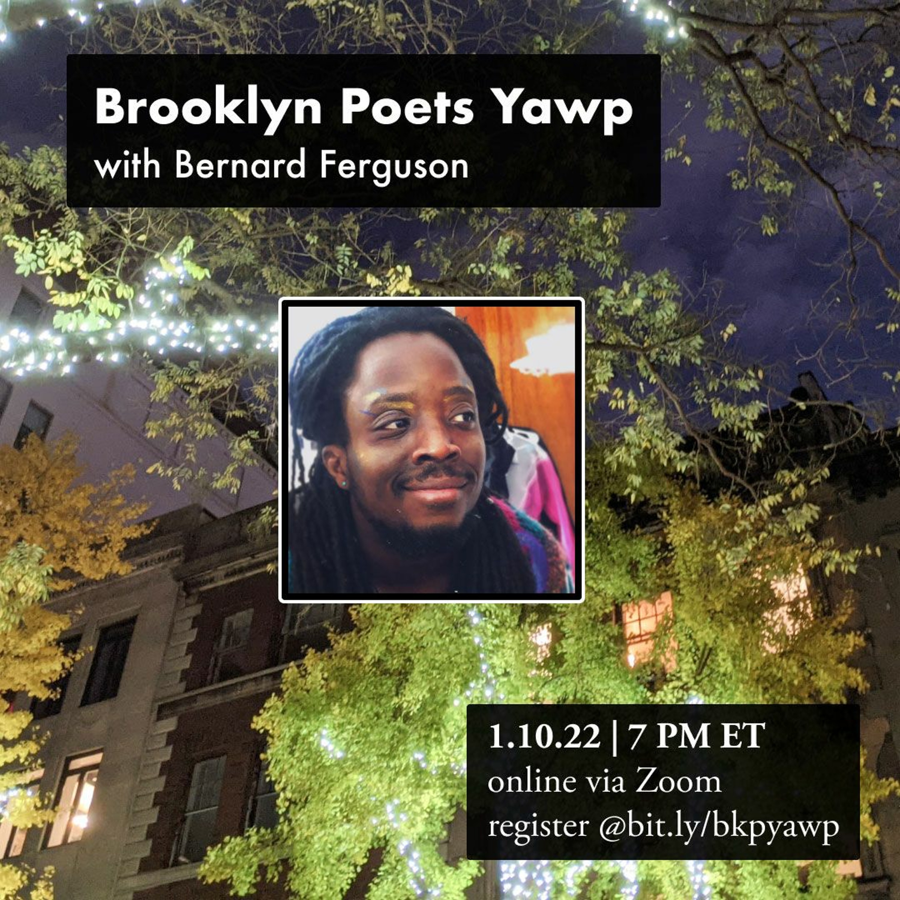 Brooklyn Poets Yawp open mic, 1.10.22, featuring Prof. Bernard Ferguson (5:08) and Poem of the Month winner Morgan Boyle for "i wrote you a poem about cockroaches and i am sorry that you are dead now" (26:30). For more info, go to brooklynpoets.org/events/yawp.