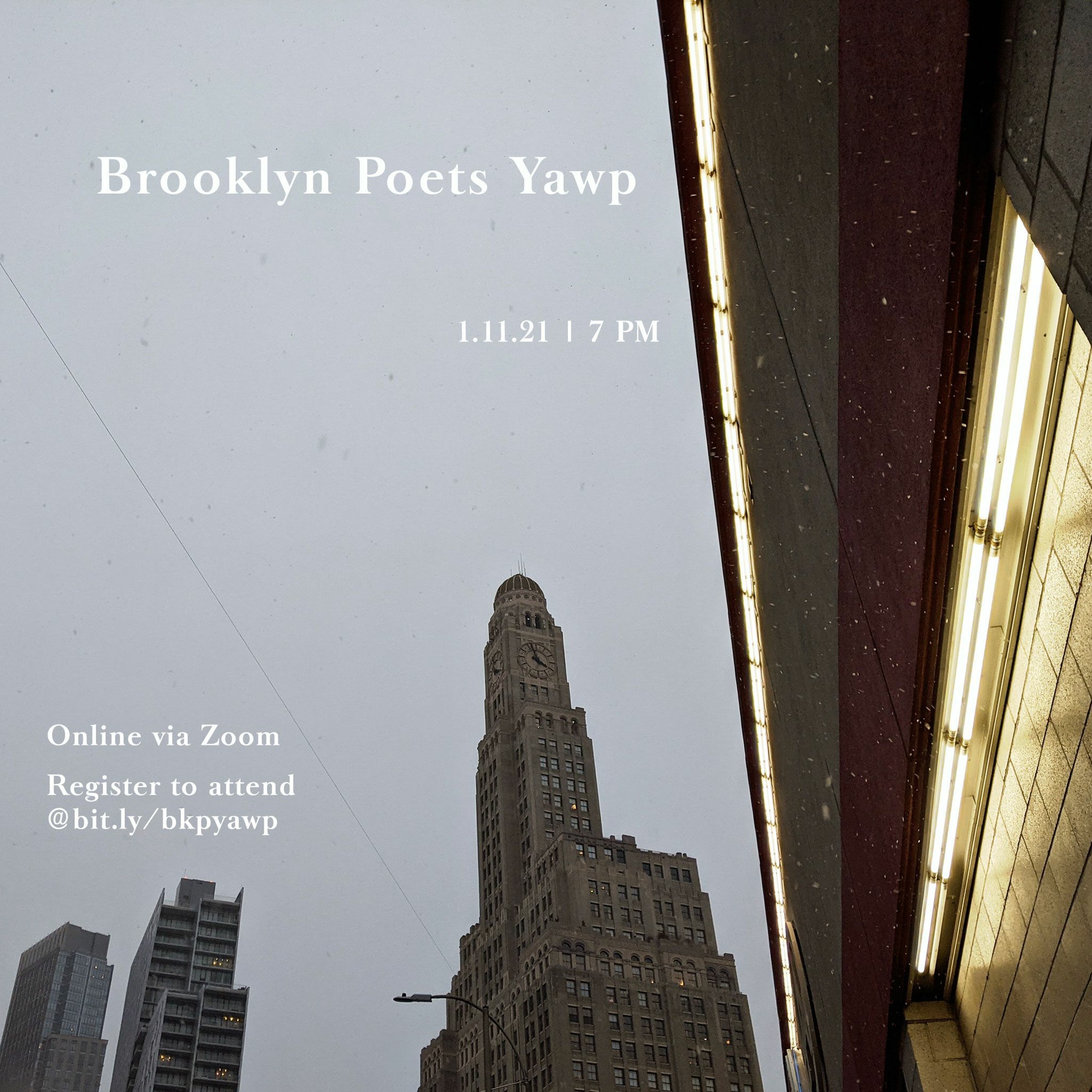 Brooklyn Poets Yawp open mic, 1.11.21, featuring Prof. Joshua Mehigan (5:07) and Poem of the Month winner Preeti Shah for "My Father Sings on My Voicemail" (1:05:35). For more info, go to brooklynpoets.org/events/yawp.