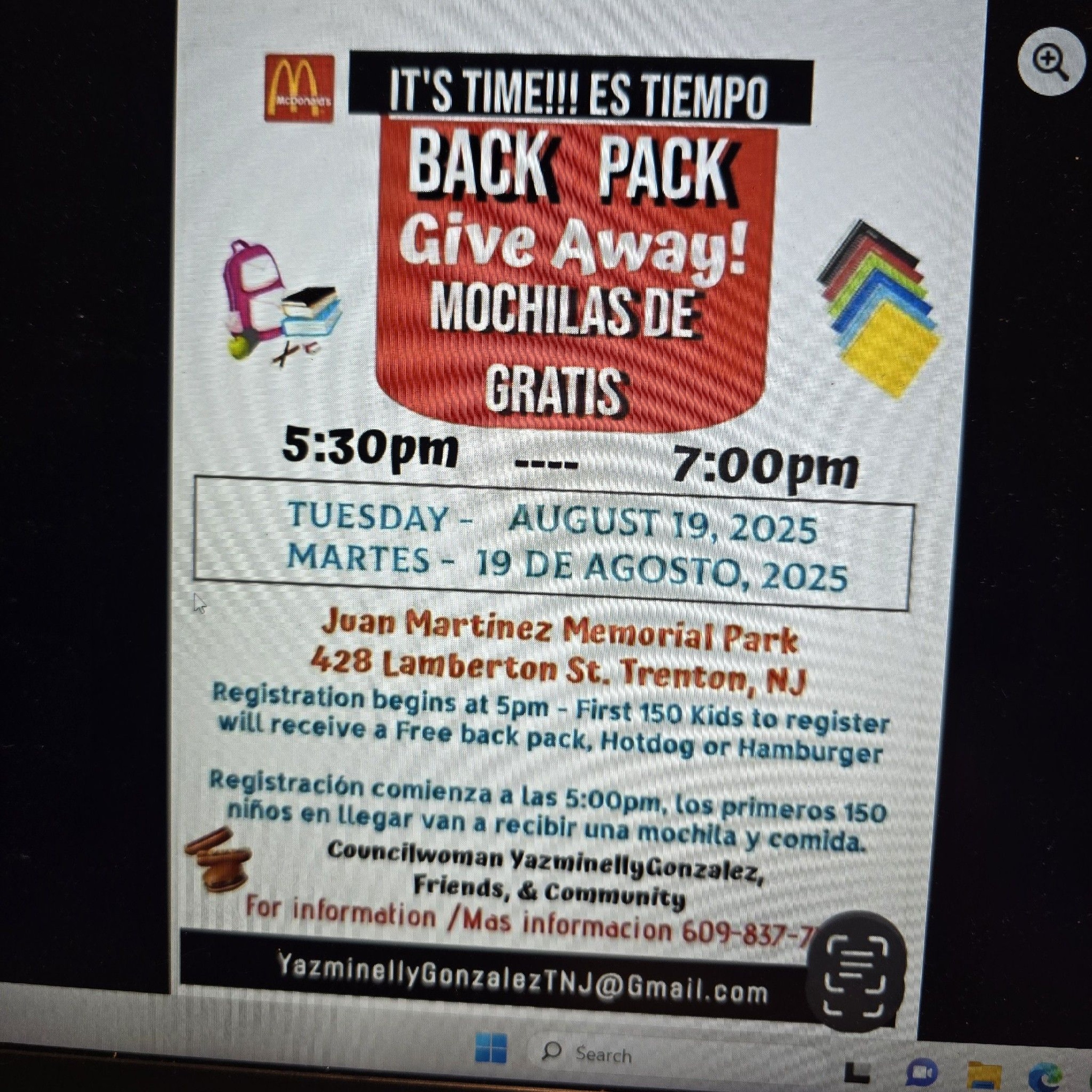Jacque Howard shares an announcement from Manitee Smith about a Back Pack Give Away in Trenton NJ at Juan Martinez Memorial Park with Councilwoman Yazminelly Gonzalez