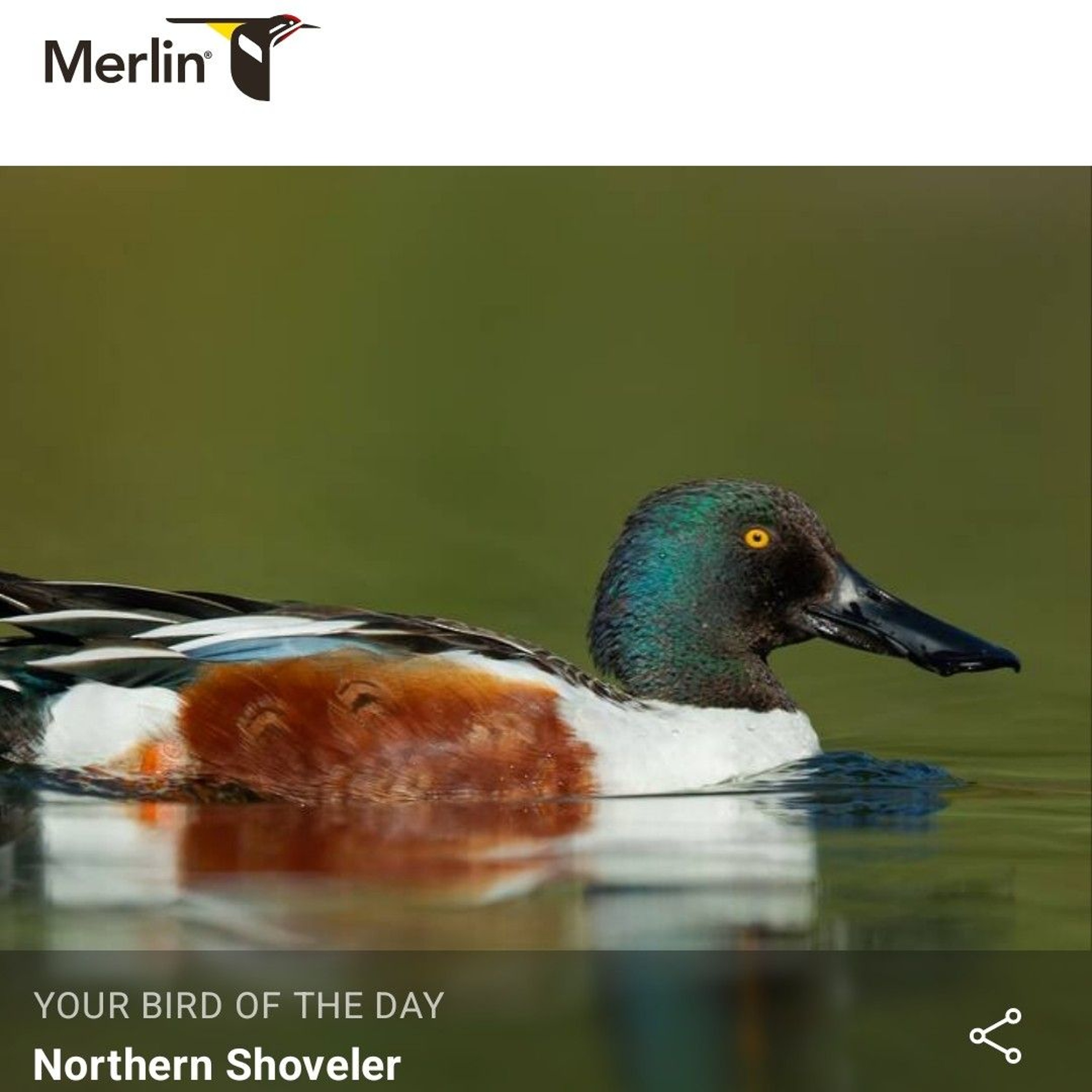 Jacque Howard shares the Merlin Bird ID app Bird Of The Day Northern Shoveler