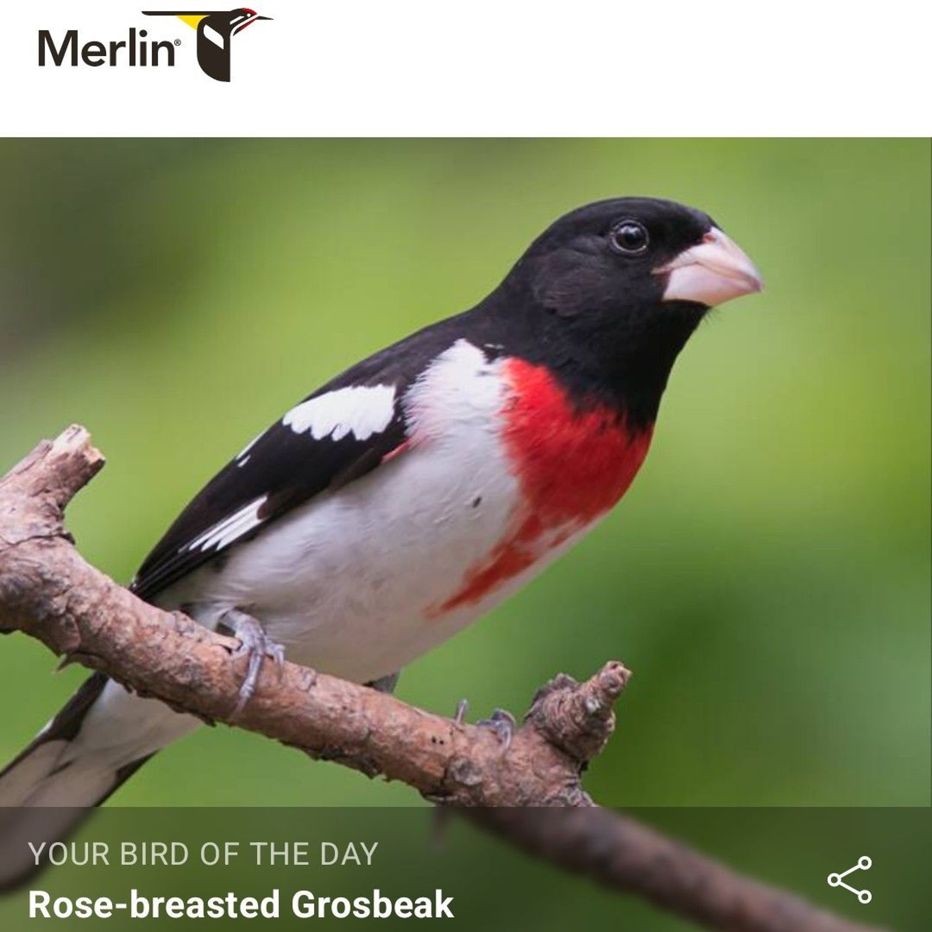Jacque Howard shares the Merlin Bird ID app Bird Of The Day Rose-breasted Grosbeak