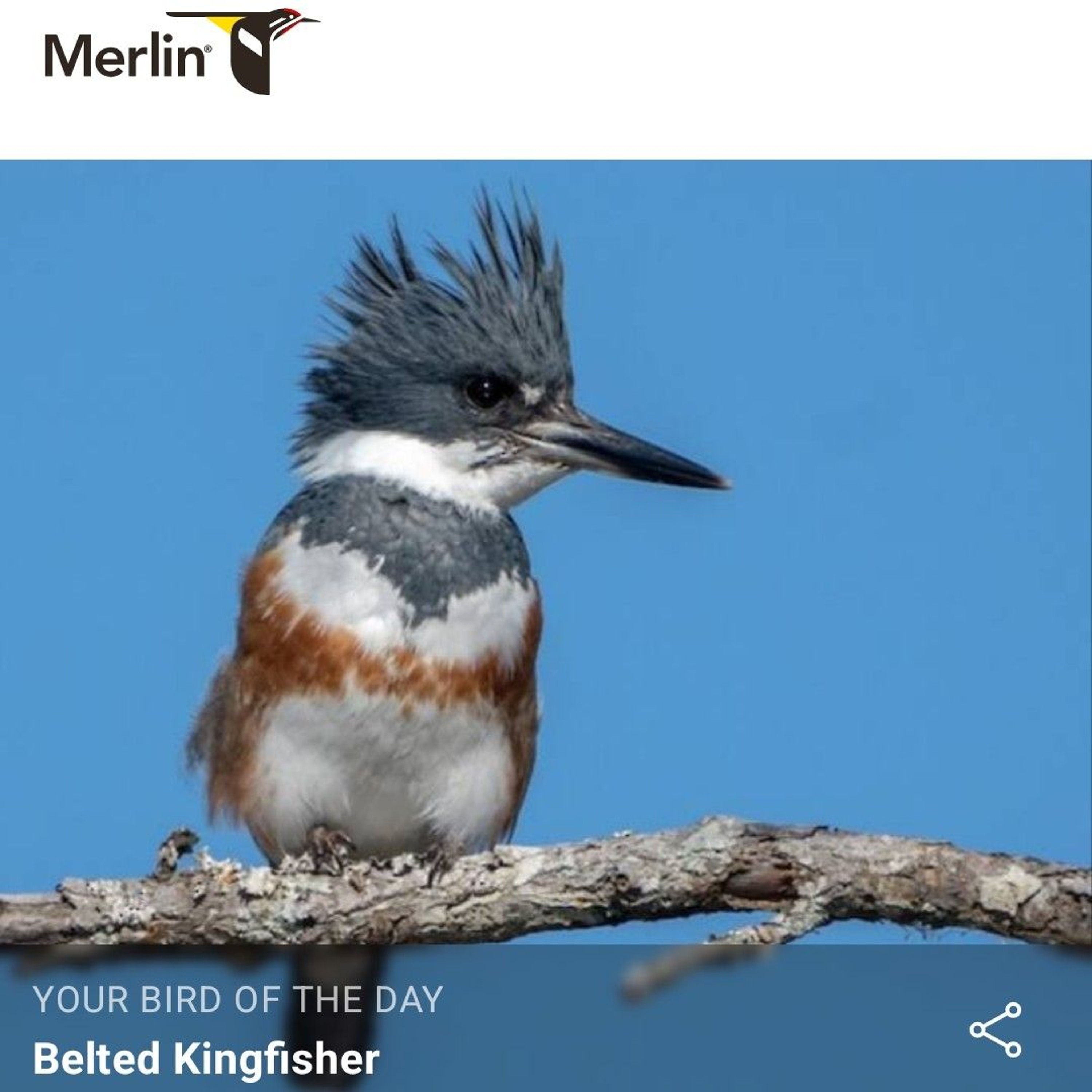 Jacque Howard shares the Merlin Bird ID app Bird Of The Day Belted Kingfisher