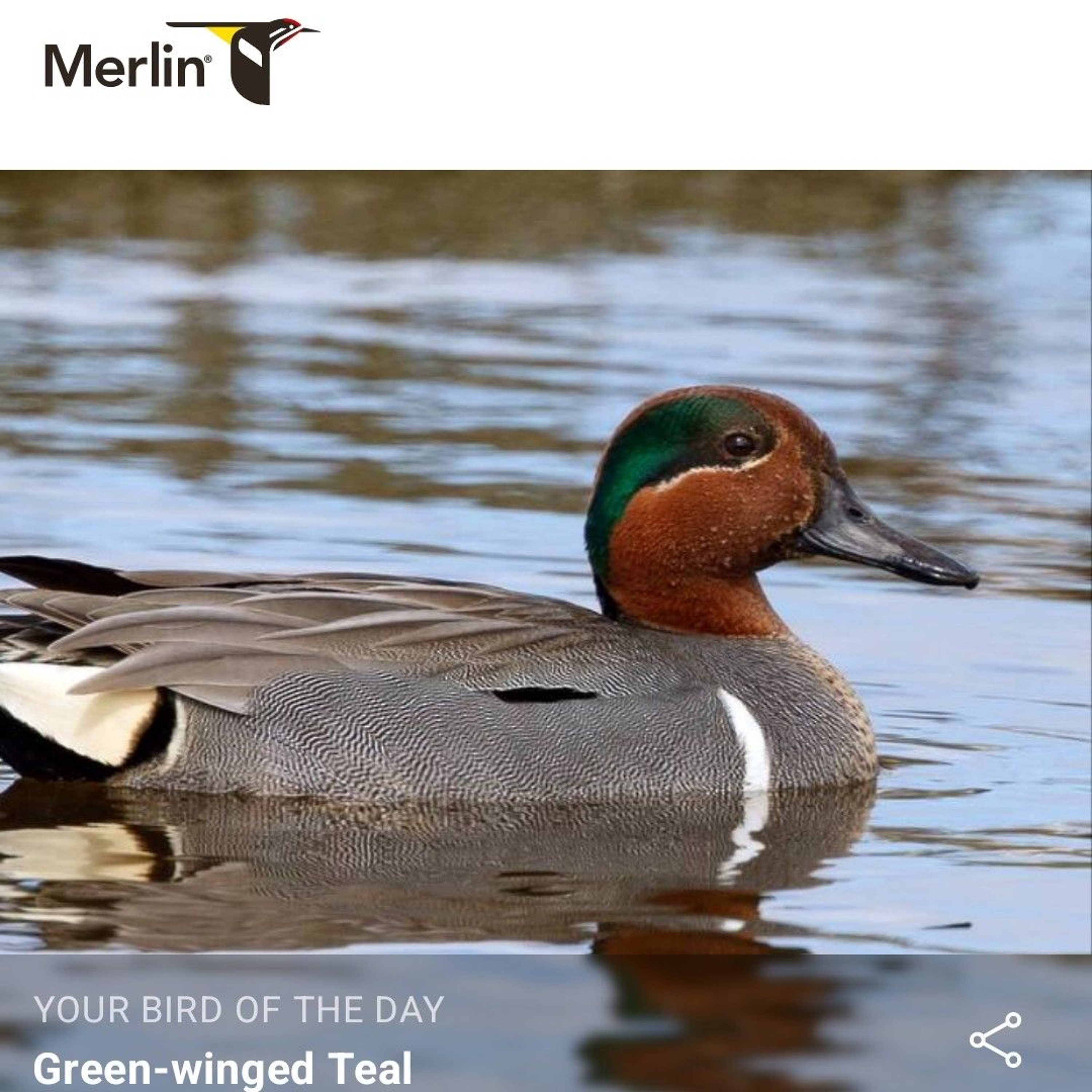 Jacque Howard shares the Merlin Bird ID app Bird Of The Day Green-winged Teal