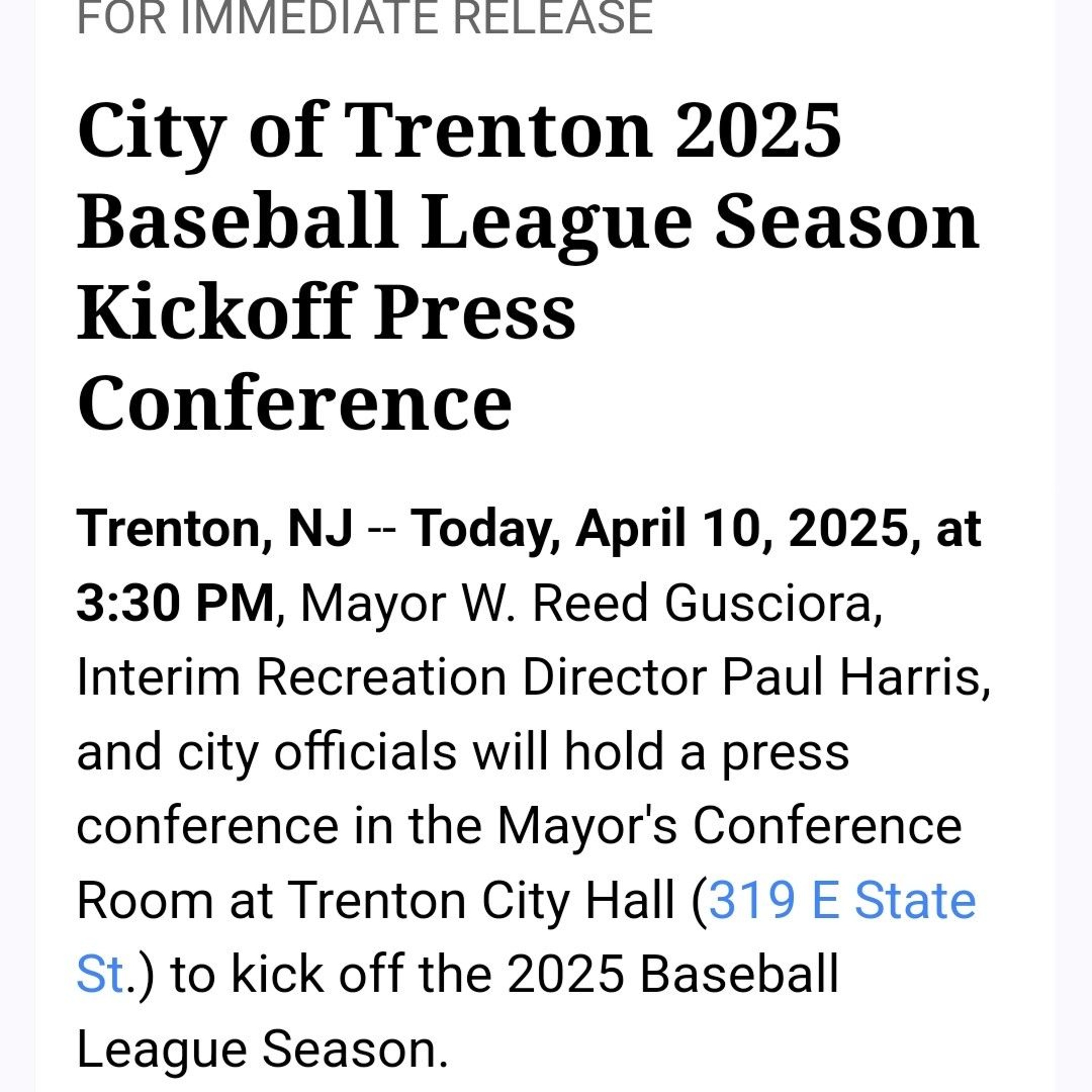 Jacque Howard shares the Press Release from the City of Trenton NJ regarding the 2025 Baseball season.