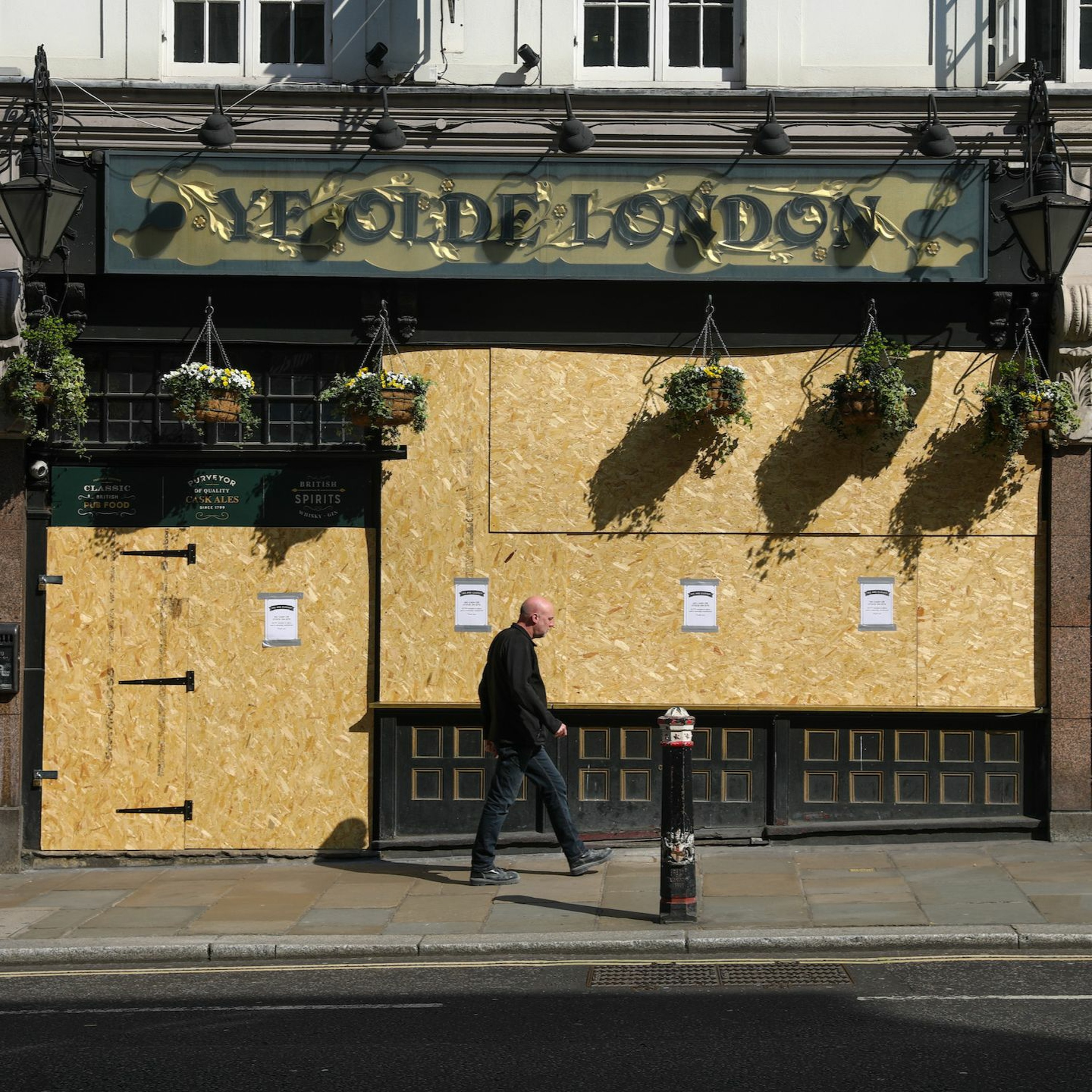 Image: A pedestrian passes the boarded up 'Ye Olde London' pub in the City district of London, U.K., on Thursday, April 9, 2020. U.K (Simon Dawson/Bloomberg via Getty Images)