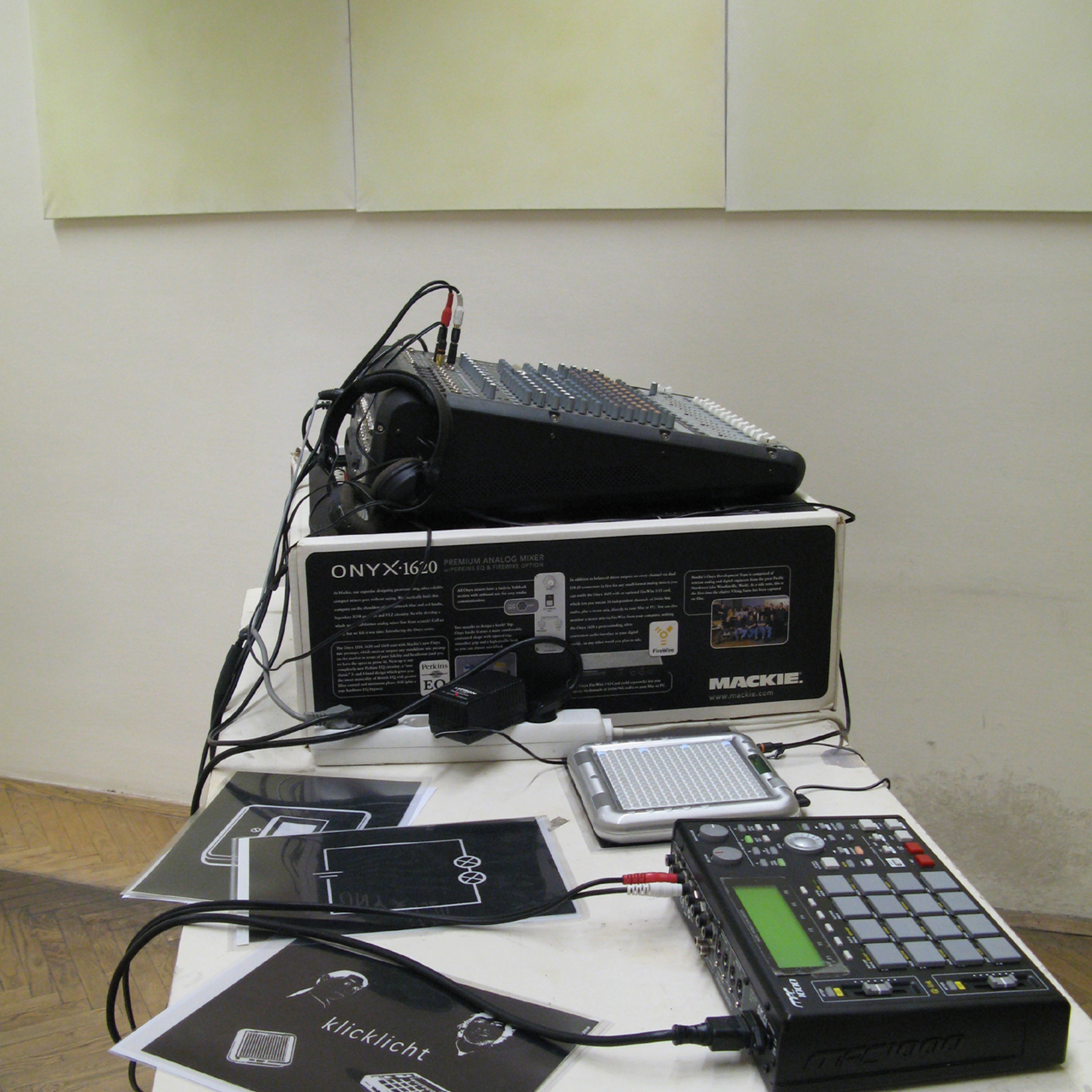 soundsamples klickender lichtschalter, surrender glühbirnen & leuchtröhren und gesprochener wörter wie ‚light on’, switch off’ - in der komposition zwischen beats & soundscapes angeordnet - bilden das ausgangsmaterial der klangperformance. stencils von lichtsymbolen auf phosphorisierenden leinwänden und die lichtquellen der elektroakustischen Instrumente visualisieren den klicklichtsound. durch diese zeitlich, räumliche abfolge von klang- und lichtereignissen wird ein performativer raum generiert.