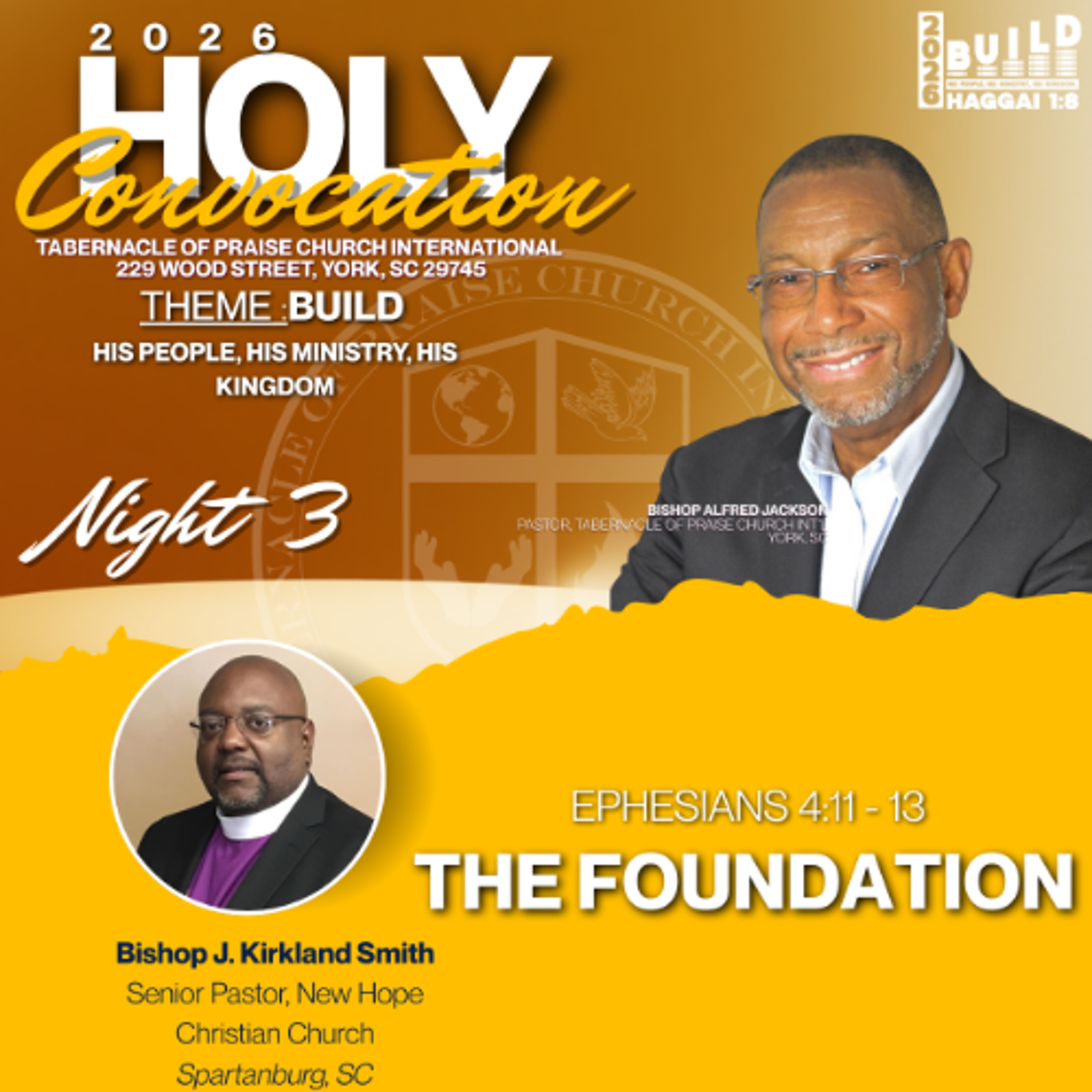 Thank you for joining us for our Holy Convocation Week! Today, Bishop Kirkland Smith. ministers from the topic, "The Foundation". We pray you are encouraged by the message.
