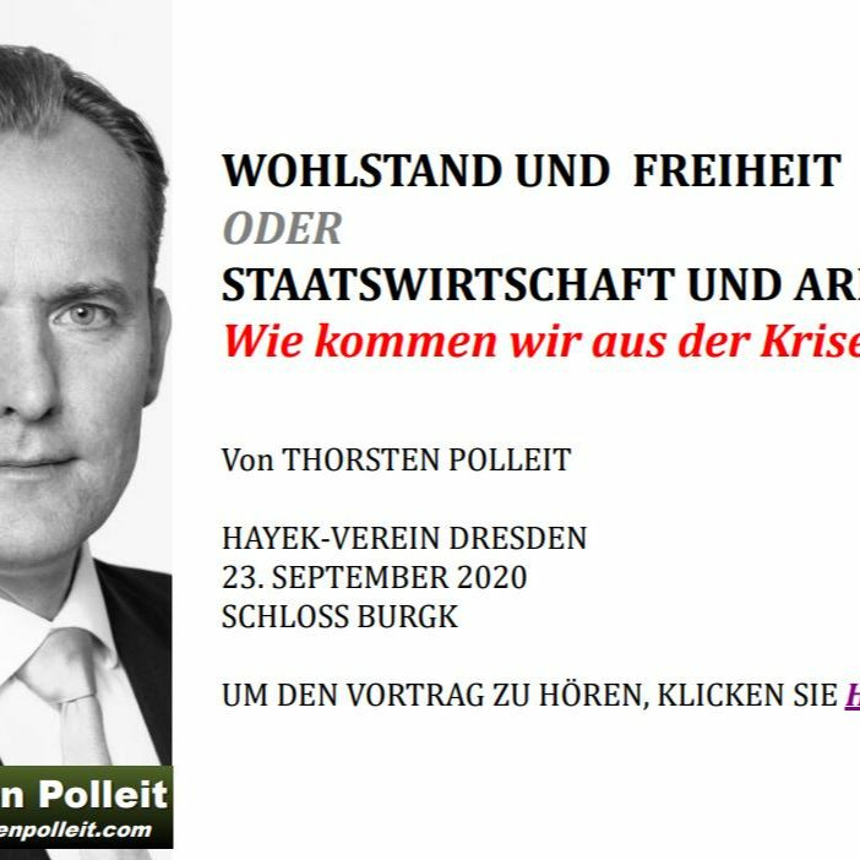 "Wohlstand und Freiheit oder Staatswirtschaft und Armut. Wie kommen wir aus der Krise?" Ein Vortrag gehalten von Thorsten Polleit am 23. September 2020 auf einer Veranstaltung des Hayek-Vereins Dresden auf Schloss Burgk.