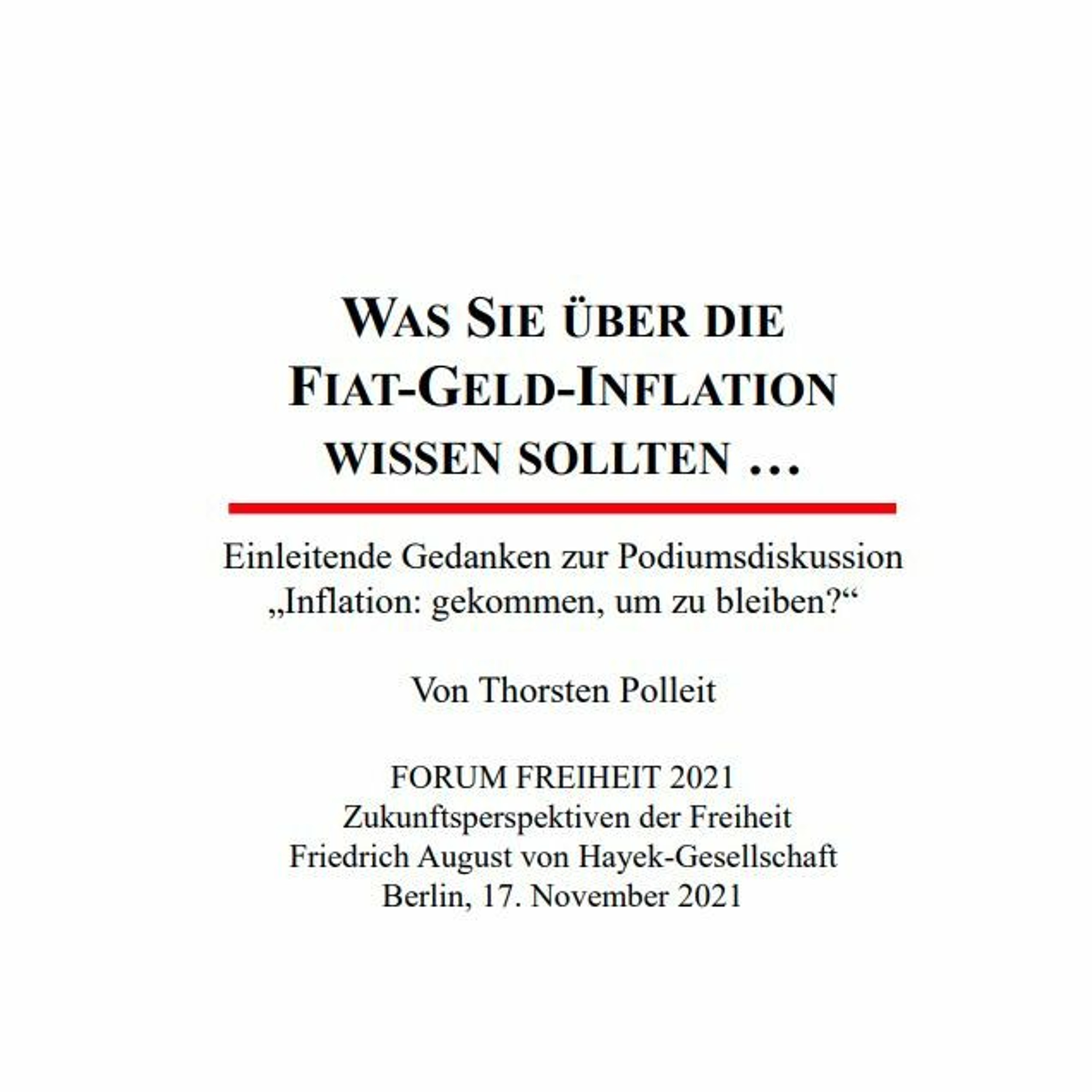 Einleitende Gedanken zur Podiumsdiskussion „Inflation: gekommen, um zu bleiben?“ von Thorsten Polleit auf dem FORUM FREIHEIT 2021 , Zukunftsperspektiven der Freiheit, Friedrich August von Hayek-Gesellschaft, Berlin, 17. November 2021.
