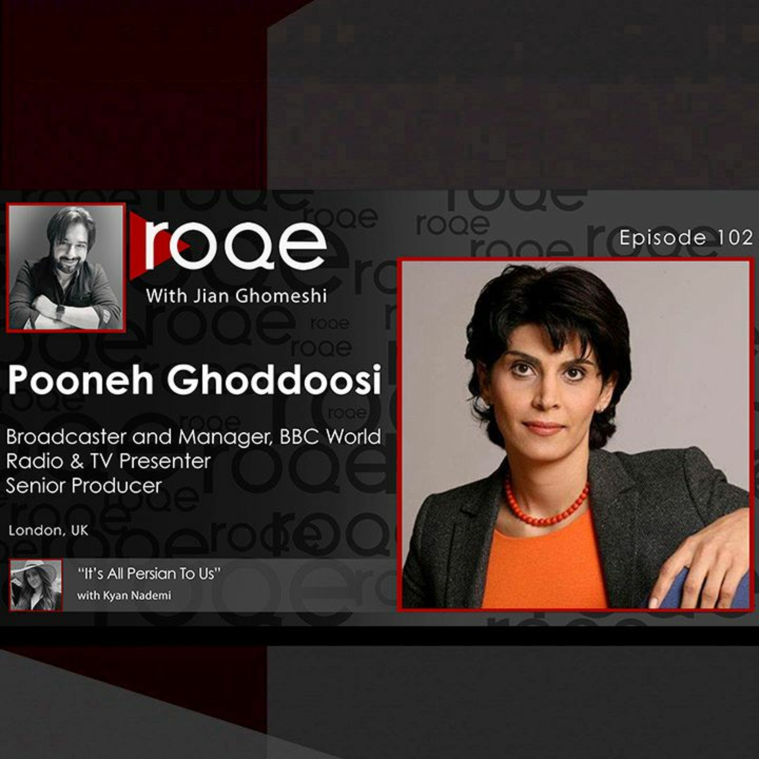 On the first anniversary of the launch of Roqe, a feature interview with world-renowned television anchor, radio presenter, and senior producer, Pooneh Ghoddoosi. Pooneh has spent over two decades at the BBC as a TV presenter on BBC World in English, a host on BBC Persian TV and radio in Persian, and now a business head of Global Partnerships at the BBC World Service. Pooneh joins Jian for an insider chat about broadcasting, changing media, and the delta between presenting news and reporting on BBC World versus doing so in Persian. She also shares her personal story and observations about the future of communications and the Iranian diaspora. Plus a new edition of “It’s All Persian to Us” with Kyan and the Roqe Team celebrates the first birthday of the program.