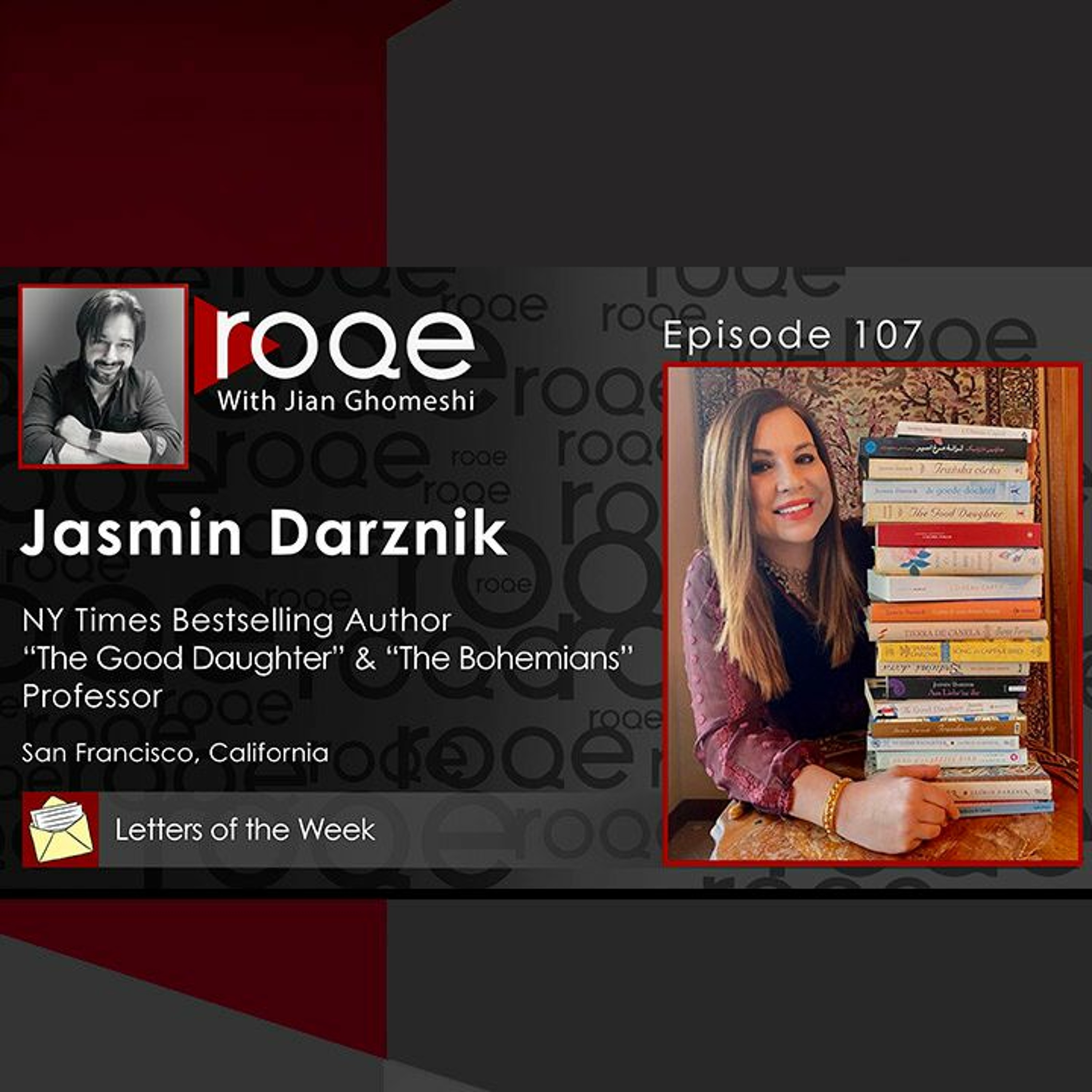 A feature interview with New York Times bestselling author, Jasmin Darznik. Jasmin is an Iranian-American writer, professor and former lawyer who burst onto the literary scene in 2011 with her acclaimed debut book, “The Good Daughter: A Memoir of My Mother’s Hidden Life.” She followed it up with “Song of a Captive Bird,” a novel inspired by the life of Forough Farrokhzad, Iran's notorious woman poet, and her latest, just released, “The Bohemians.” Jasmin joins Jian to discuss her journey as an Iranian kid in denial growing up in California, learning - while a grad student at Princeton - of her mother’s harrowing life story, fighting ‘imposter syndrome’ while attaining success, and finding her voice as an internationally recognized writer. Plus the Roqe Team convenes to pore through Letters of the Week and Bahman Ghobadi.
