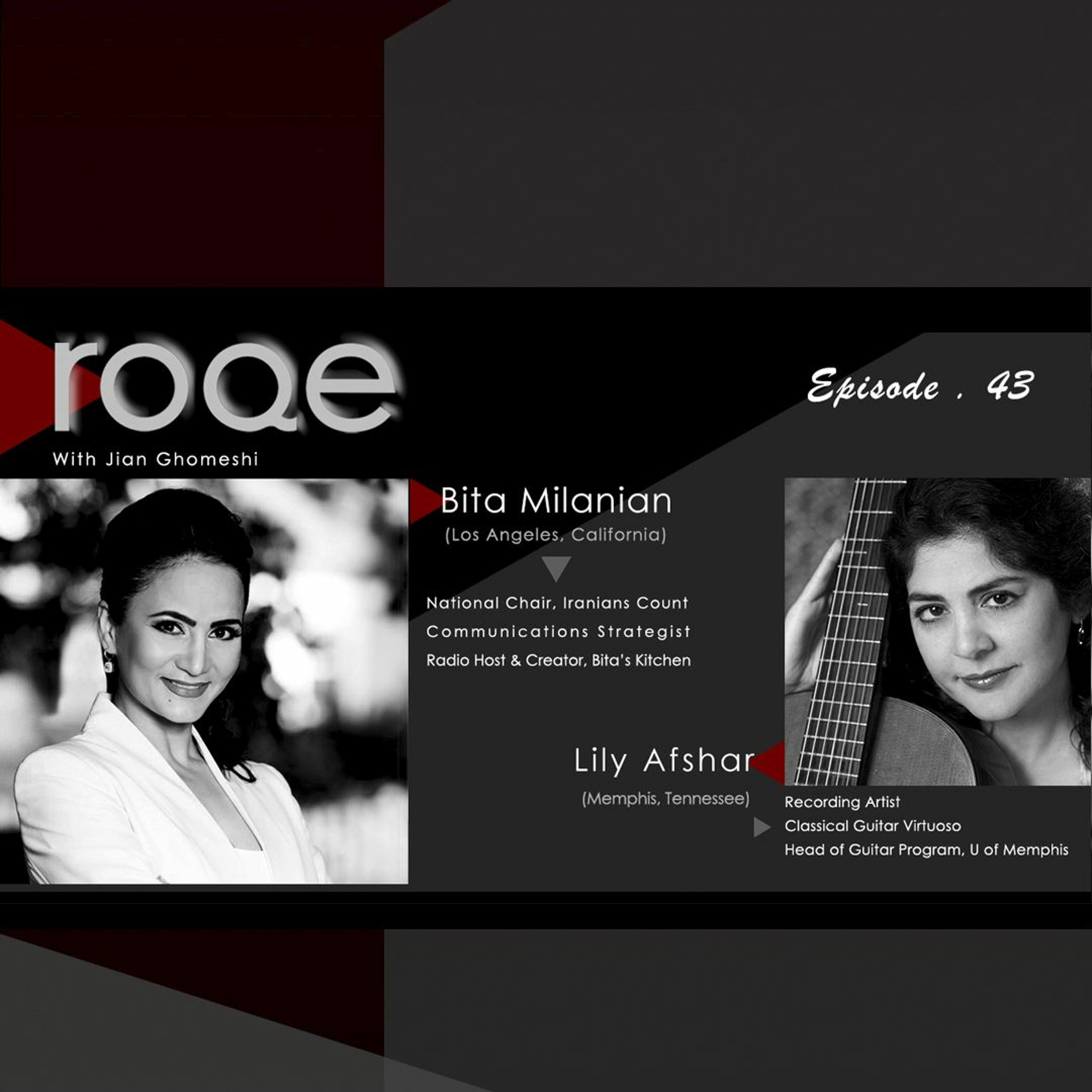An interview with Iranian-American communications strategist, radio host, and national chair of Iranians Count, Bita Milanian, about the campaign to have people of Iranian descent in the United States sign up for the 2020 census. Plus classical guitar virtuoso Lily Afshar joins Jian to recount her journey from a kid in Tehran to the top stages of the world as a master classical guitarist. And the Roqe Team convenes with banter about squirrels, chicken wing mehmoonies, and the Letters of the Week.