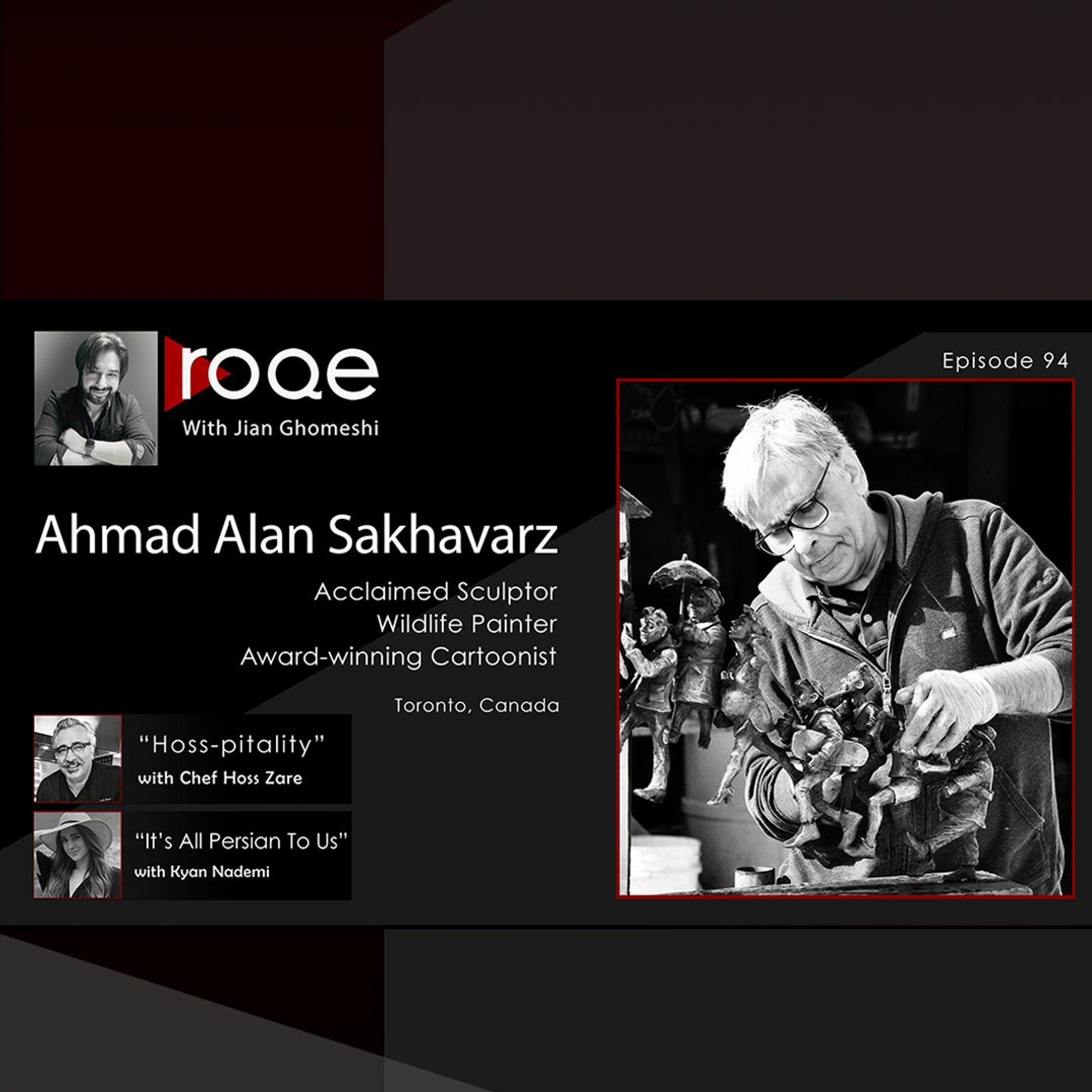A feature interview with acclaimed Iranian-Canadian sculptor, painter and cartoonist, Ahmad Alan Sakhavarz. Ahmad joins Jian to discuss his remarkable and award-winning career in three acts - from his work as a prominent political cartoonist at famous magazines and newspapers in Iran, to his move to Canada and transition into popular wildlife painter, to - finally - his evolution into world-renowned sculptor. Plus Nowruz-themed new editions of “It’s All Persian to Us” and “Hoss-pitality,” and the Roqe team debates the traditions of ‘chaharshanbe soori.’