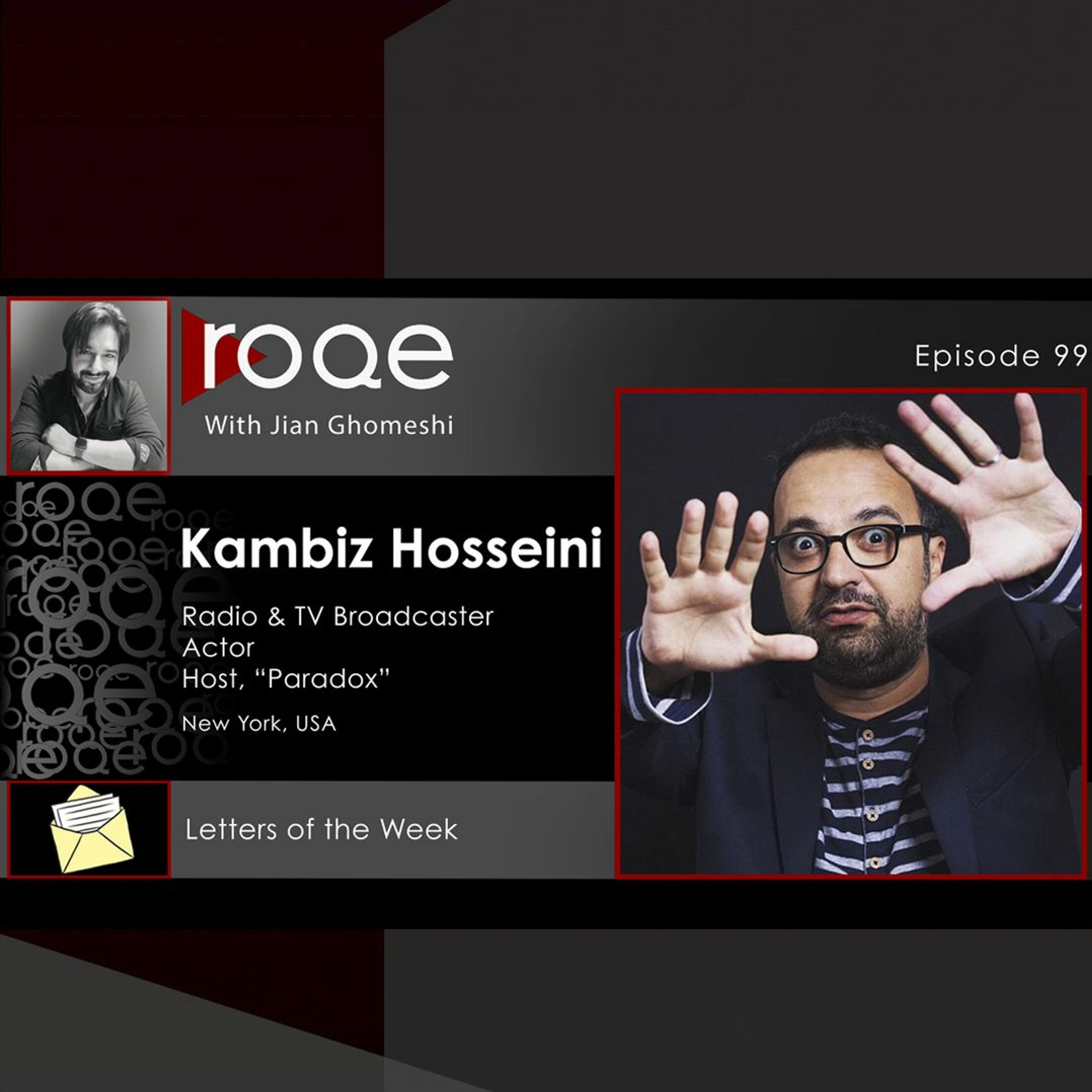 A feature interview with groundbreaking Iranian-American political satirist, actor, TV/radio broadcaster, and monologist, Kambiz Hosseini. Kambiz joins Jian for a rollicking, wide-ranging and very personal interview about his life journey, his broadcasting style, his disappointments, and his latest show, Paradox. This is a rare in-depth interview with Kambiz in English and the energy between the two hosts is palpable. Plus, the Roqe Team reveals the big guest for the 100th episode and combs through the latest Letters of the Week.