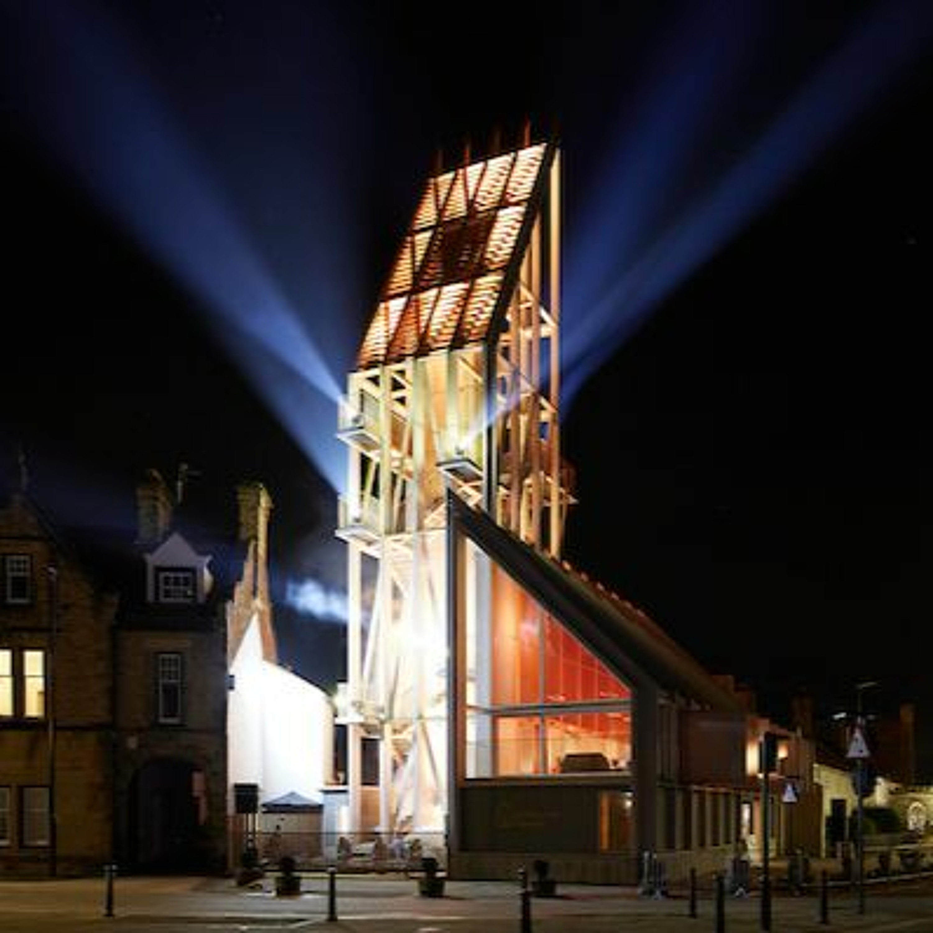 The Drop (2023), a beacon of light and sound by internationally renowned, UK lighting designer Phil Supple for L:umiere 2023. Beams, patterns and lights, choreographed to a lively musical score composed by collaborator and sound artist Toby Park, illuminated the full height of the Auckland Tower in Bishop Auckland.