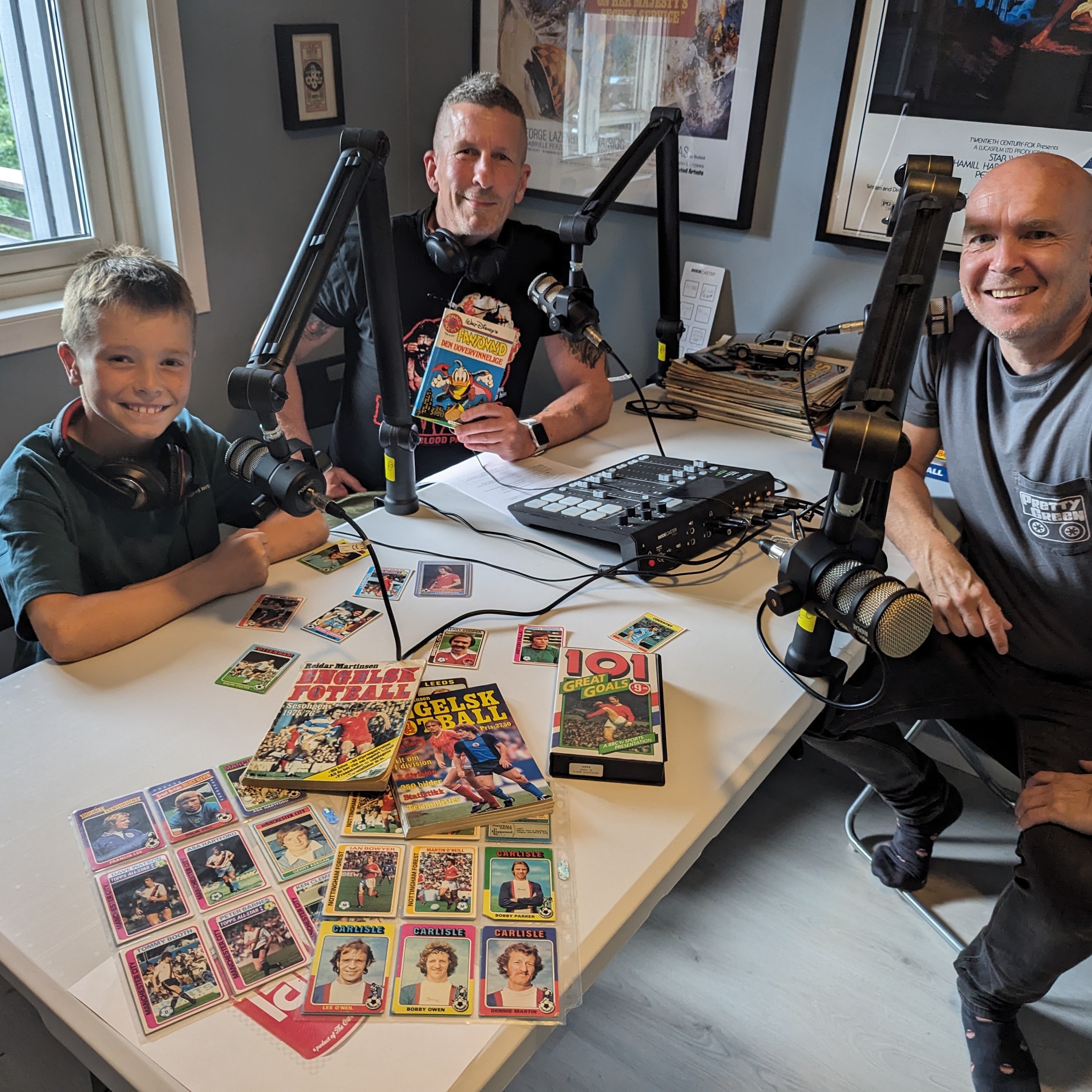Old-timerne Alan og Lars får besøk av David 10 år, for en prat om fotballkort anno 2023.