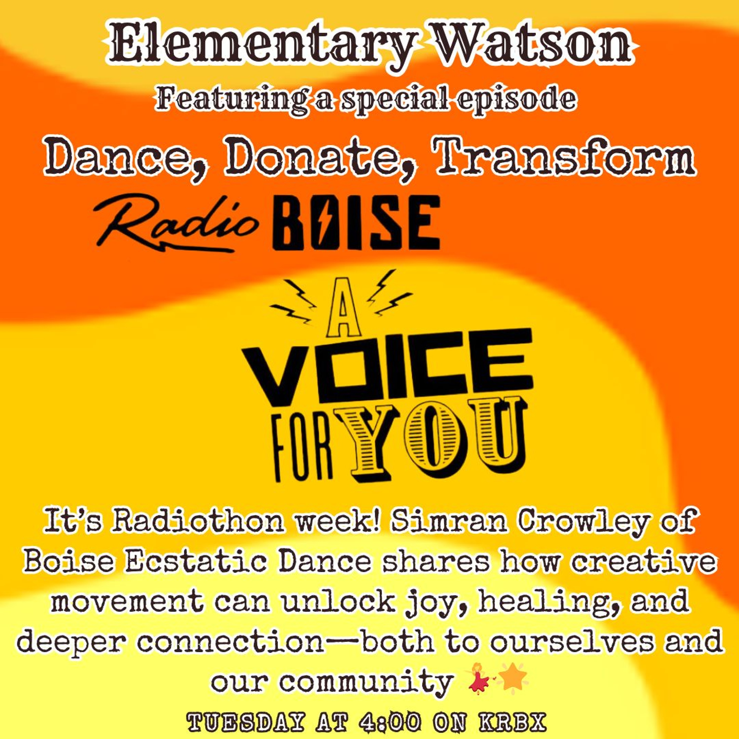 📣 It’s here—Radiothon 2025 is in full swing, and we’re turning up the volume on transformation, movement, and community! 🎉📻 This week on Elementary Watson, Simran Crowley from Boise Ecstatic Dance joins us to show how creative movement can help us live our best lives. 🕺💃