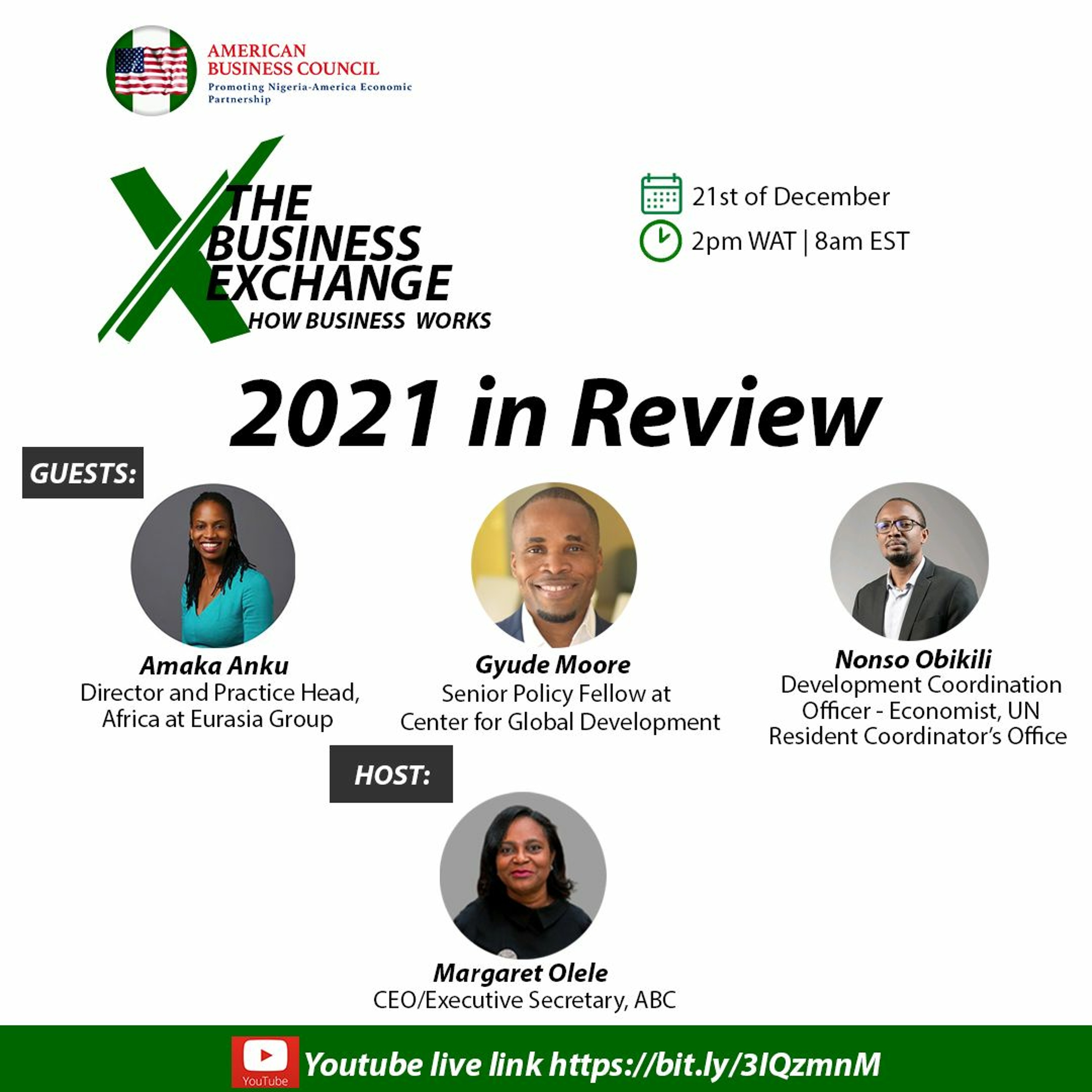 Here Margaret Olele of the American Business Council reviews and discusses the monumental events of 2021 with Nonso Obikili of the United Nations, and Gyude Moore of the Centre for Global Development. The discussions touch on the Nigerian Economy, Africa's relations with China, the US, and the EU, Energy poverty in Africa, COP26, COVID-19 variants (Omicron) and Government's reaction, US Democracy Summit, and expectations for 2022.