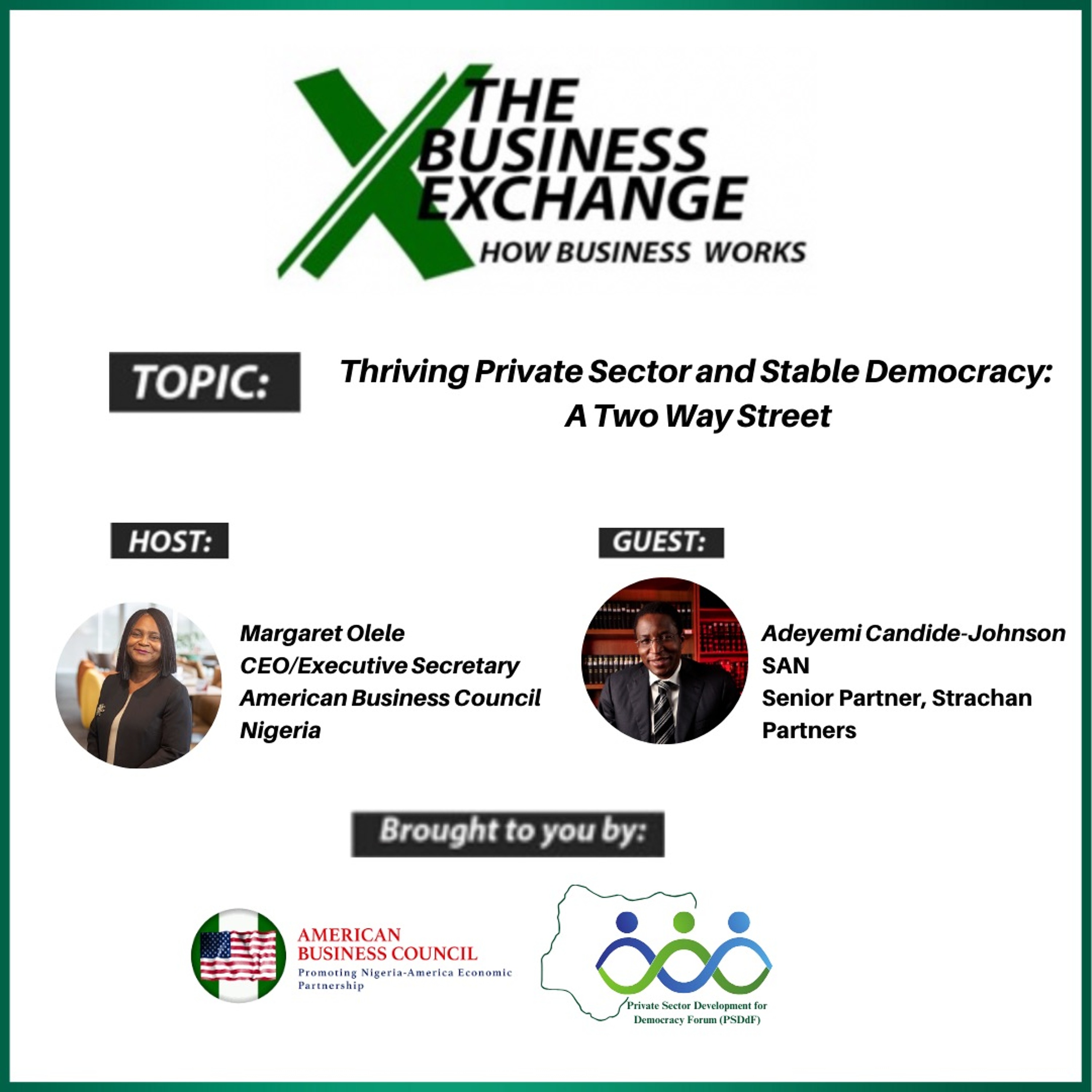 On this episode of the business exchange, Adeyemi Candide-Johnson, S.A.N speaks with Margaret Olele about the role of the newly founded Private Sector Development for Democracy Forum (PSDdF) as well as the importance the private sector plays in improving democracy in Nigeria.
