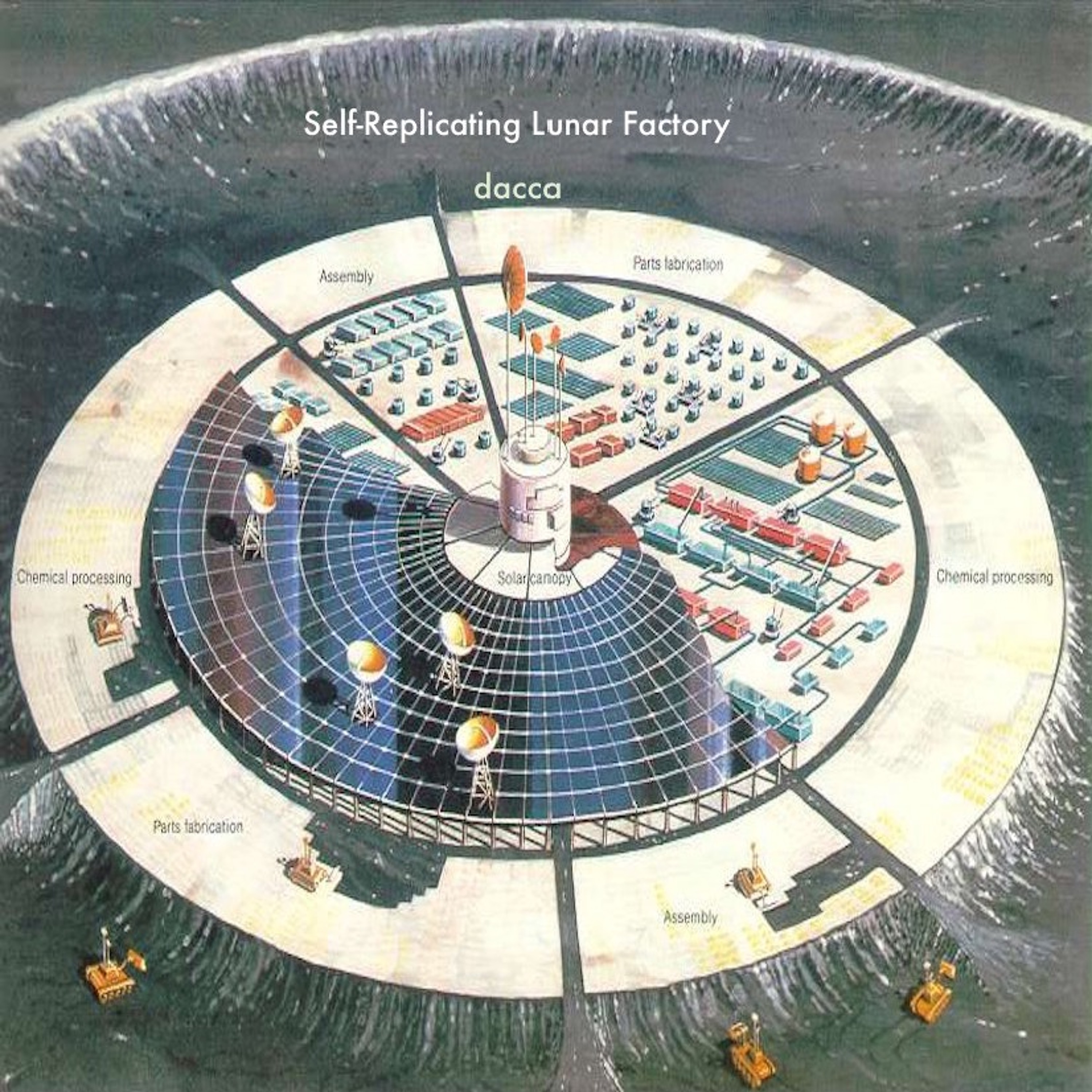As a commonplace thing the self-replicating lunar factory is probably quite a long way off, but the concept of self-replicating machines (which are a step along the way) is an exciting and real one, so that's what inspired this track.