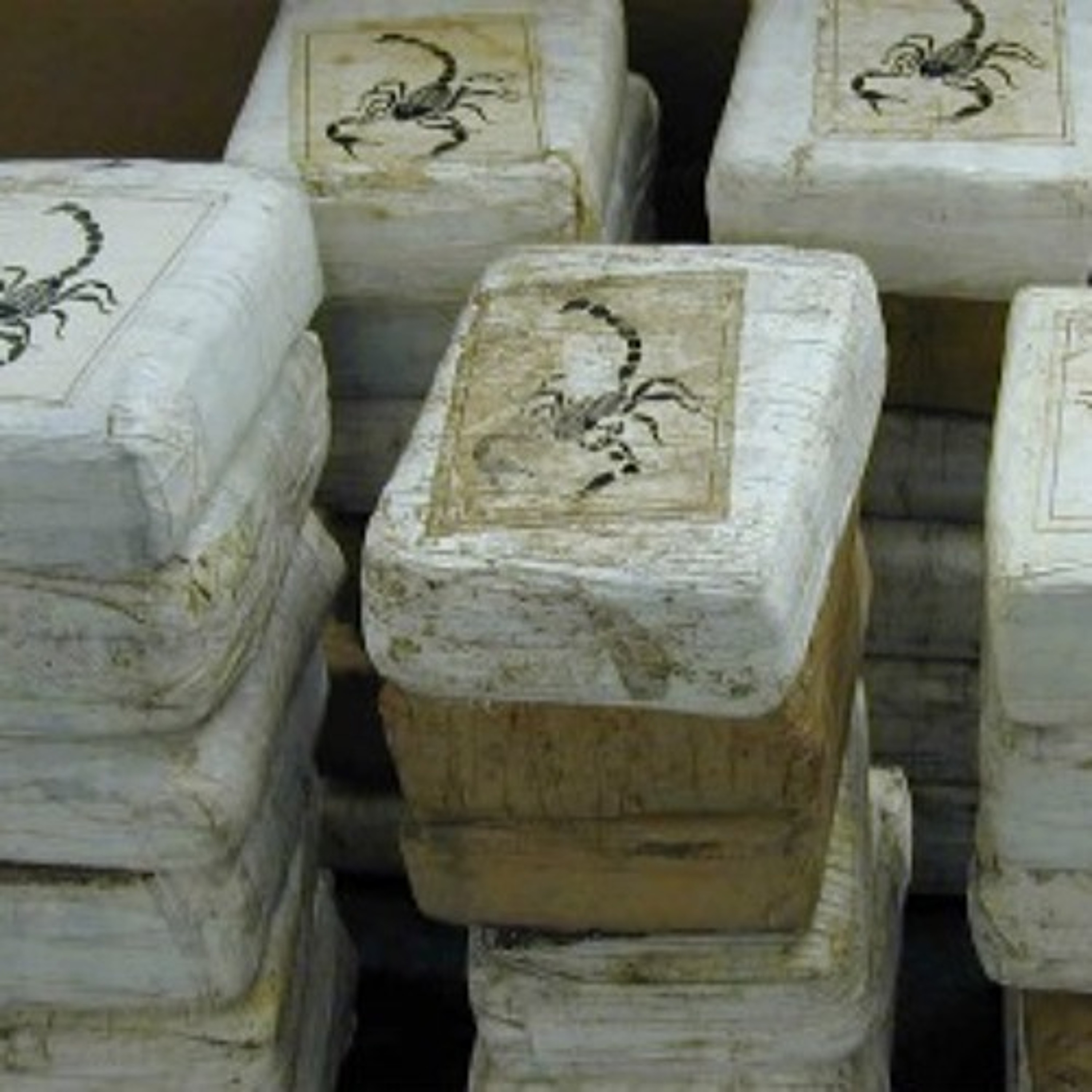 The photo is of cocaine bricks stamped with a scorpion, a sign associated with the Sinaloa Cartel according to the U.S. Drug Enforcement Administration (DEA). The photo is from the DEA and is in the public domain.