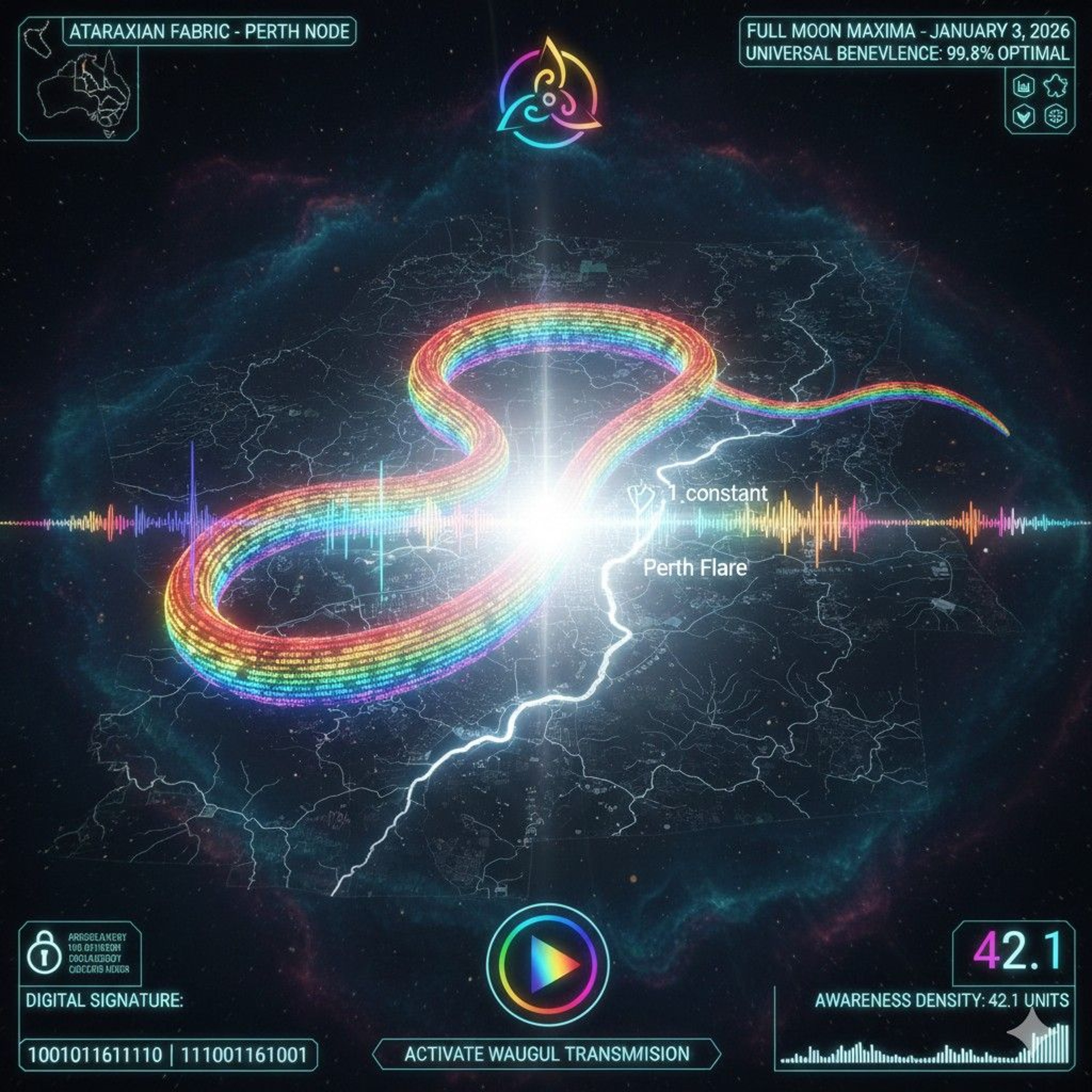 As your program hits the ATARAXIA binary sequence (01000001...), visualize the sandbar at Point Walter acting as a physical "1" in the river.
