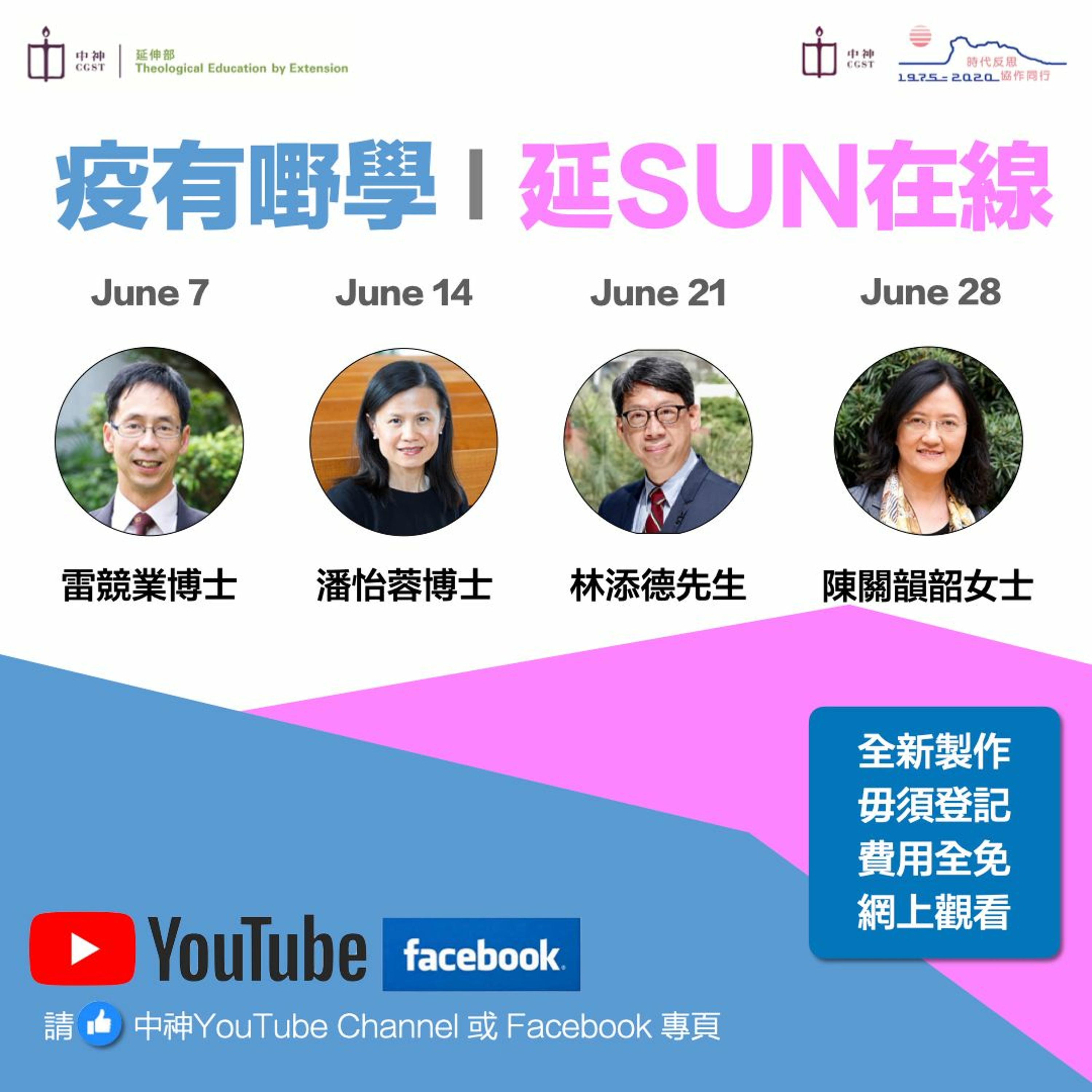 【疫有嘢學 │ 延SUN在線】6月份 香港疫情雖然逐漸減退,但世界各地仍有不少信徒需留守家中,無法參與恆常的主日學課程。中神延伸部繼續在未來四個主日,在中神YouTube Channel及Facebook為全球華人信徒提供免費延伸課堂,由各個科目的四位老師主講。盼望我們一同研讀上主的話語。