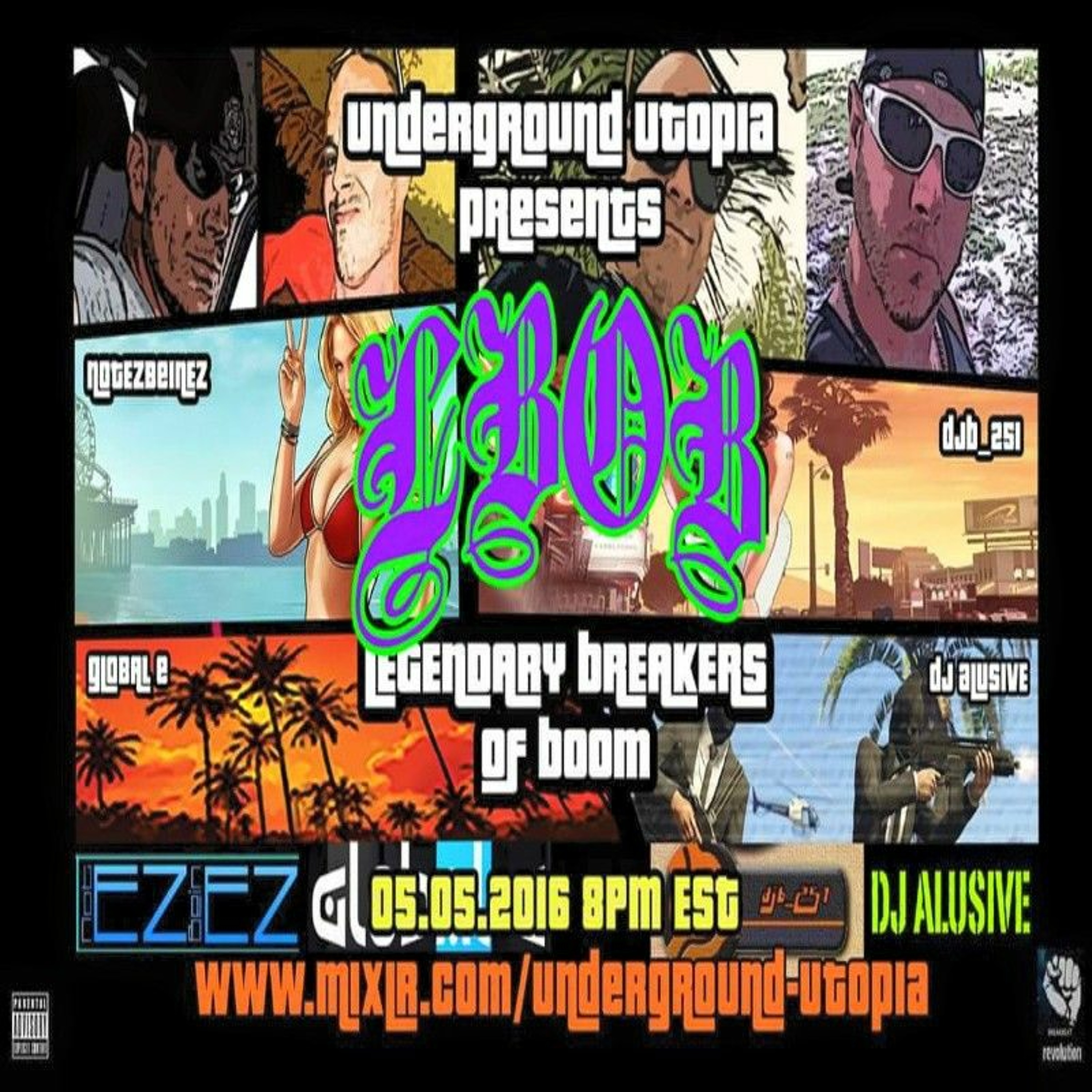 Yo my friends, here is the L.B.O.B. broadcast on 5/5/16 via Underground Utopia featuring in order the dope styles of my Legendary Brothers: NotEZBeinEZ, myself (GLOBALE), DJB_251 & DJ Alusive.. who all slayed it & kept the chat room bumpin' the entire 2hours!! Many thanks again to Edward Hughes aka Underground Utopia for hosting the Legendary Breakers of Boom & look for more collabs via this platform in the very near future.. thank you all that tuned in & continue to support L.B.O.B. we love ya all!! 1 LOVE