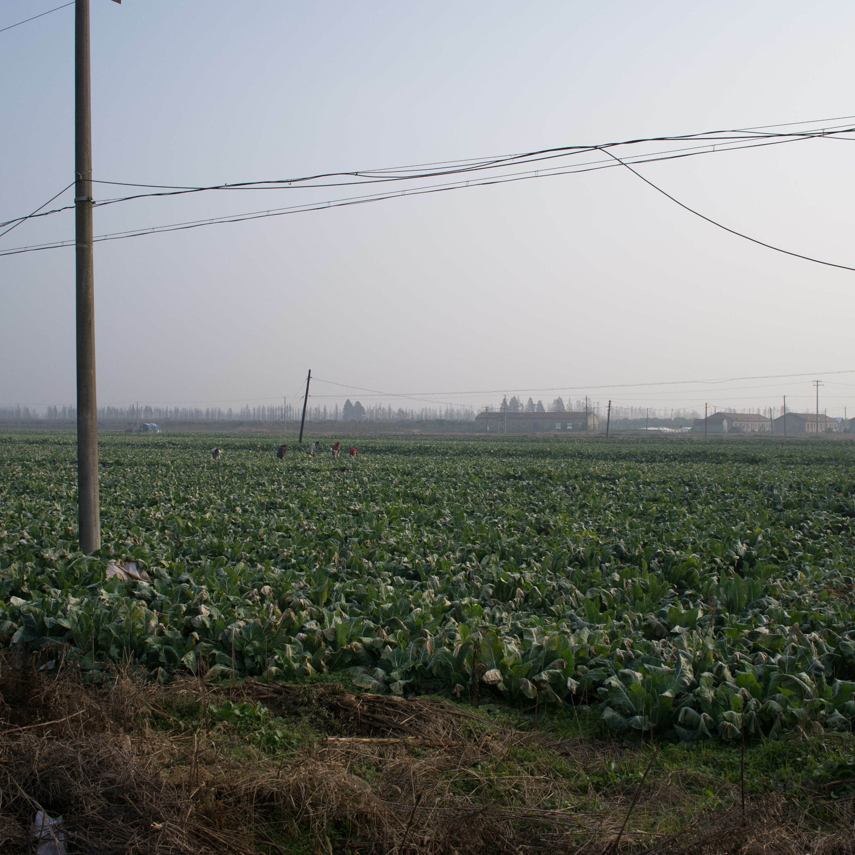 Distant workers tending crops. Plane. Quiet morning.