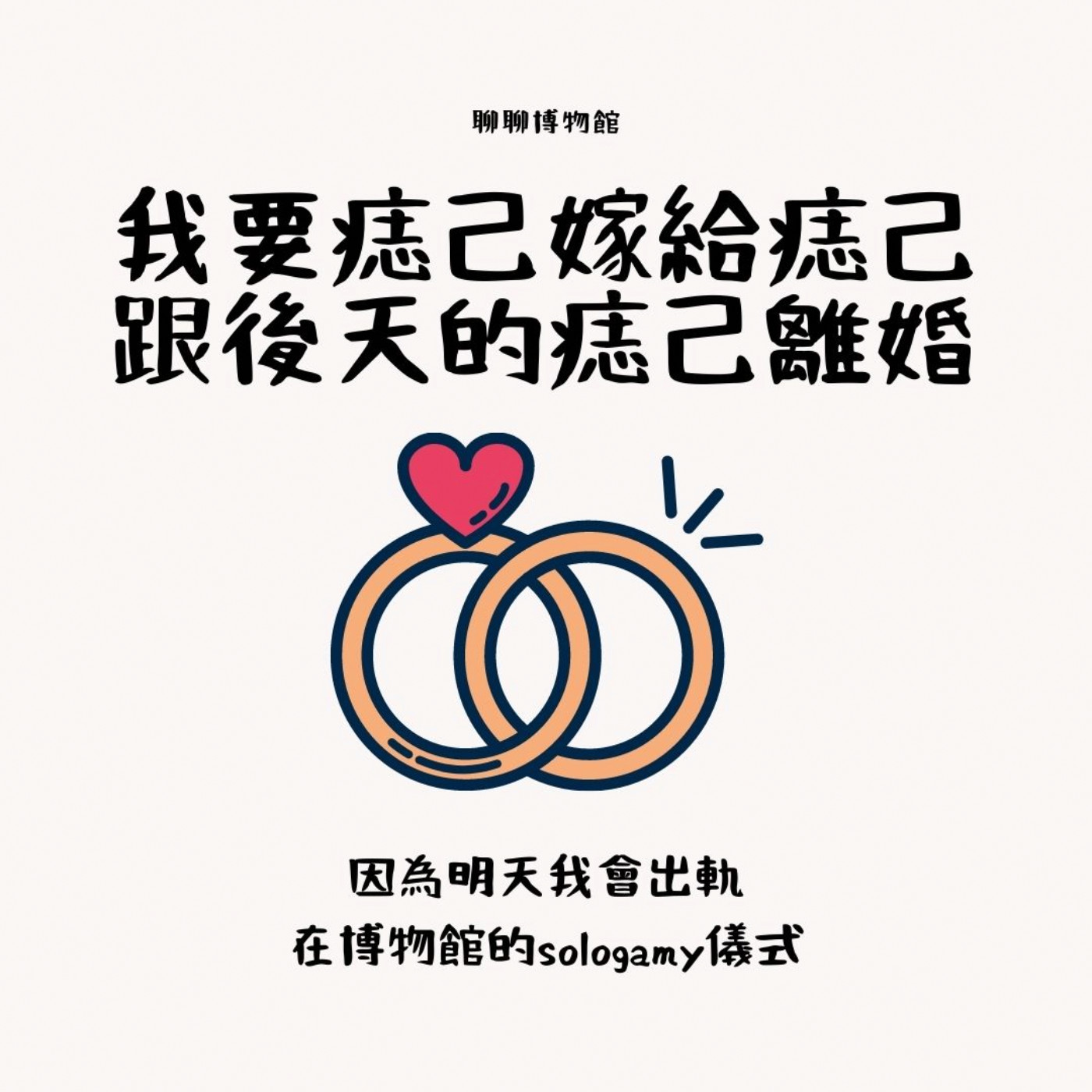 愛自己最重要,但與自己結婚?然後還在博物館跟自己結婚?風靡全球超過十幾年的sologamy風潮,也吹進了博物館裡面,誰不想要在博物館的宏偉建築中,有160個人圍著你大聲稱讚你的感動時刻呢?今天我要痣己嫁給我痣己,然後跟明天的痣己離婚。