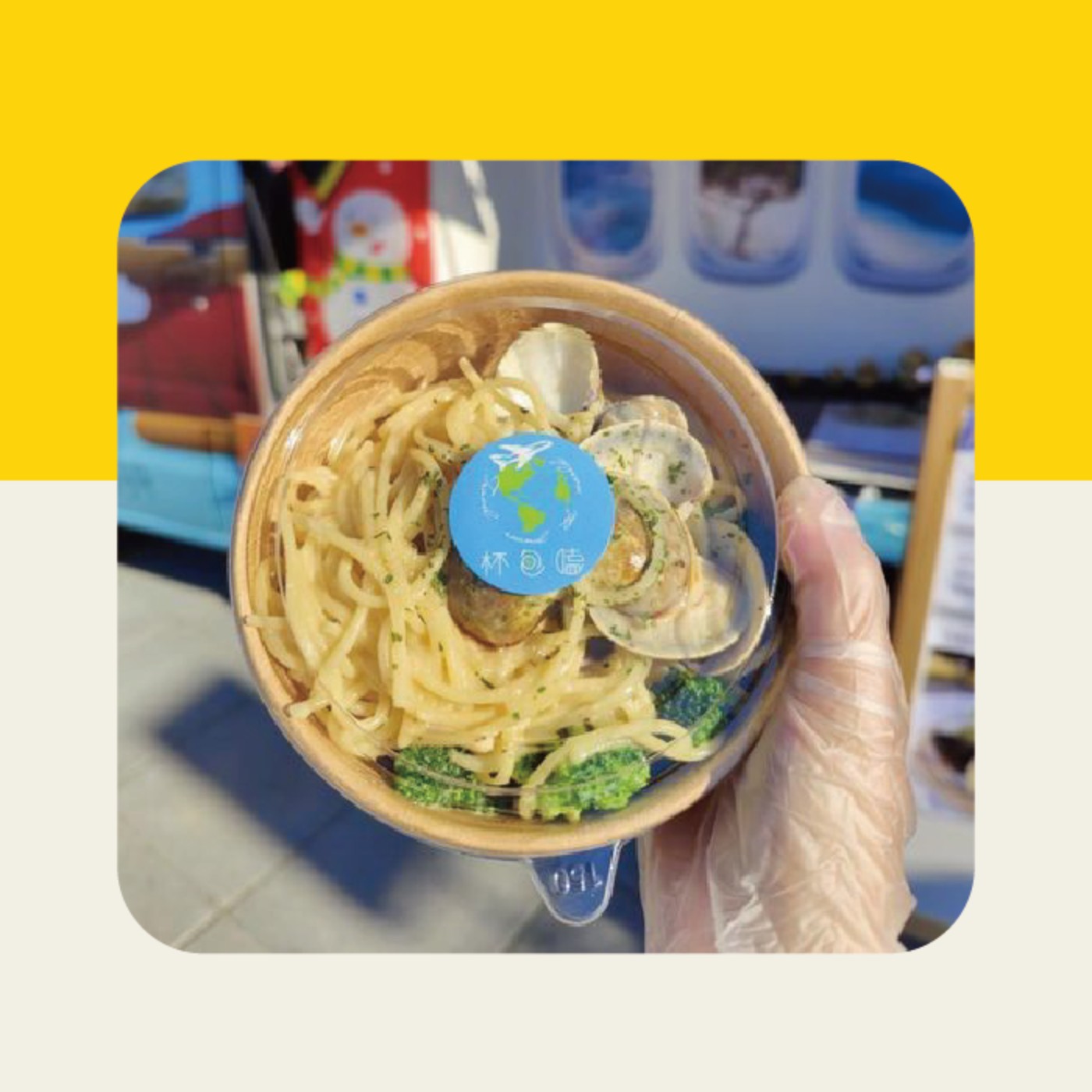 『杯包嗑』是一台專賣義大利麵的行動餐車,由喜愛旅遊和美食的小資夫妻共同經營,有著飛機窗和天空藍的餐車設計、世界地圖的Logo、諧音「背包客」的品牌命名,希望可以透過餐車走遍各地認識大家,將愛與善傳遞出去。