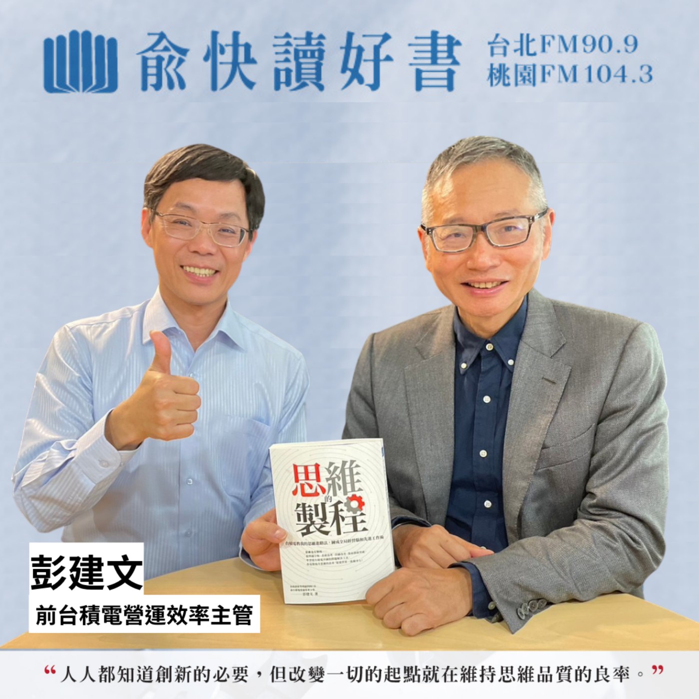 曾當選台積電師鐸獎的特優企業導師彭建文,在本週一上午8:00俞快讀好書節目中,帶您一窺台積電如何跳脫舊有思維模式,優化思維的製程,提升思維良率的神奇魔法。