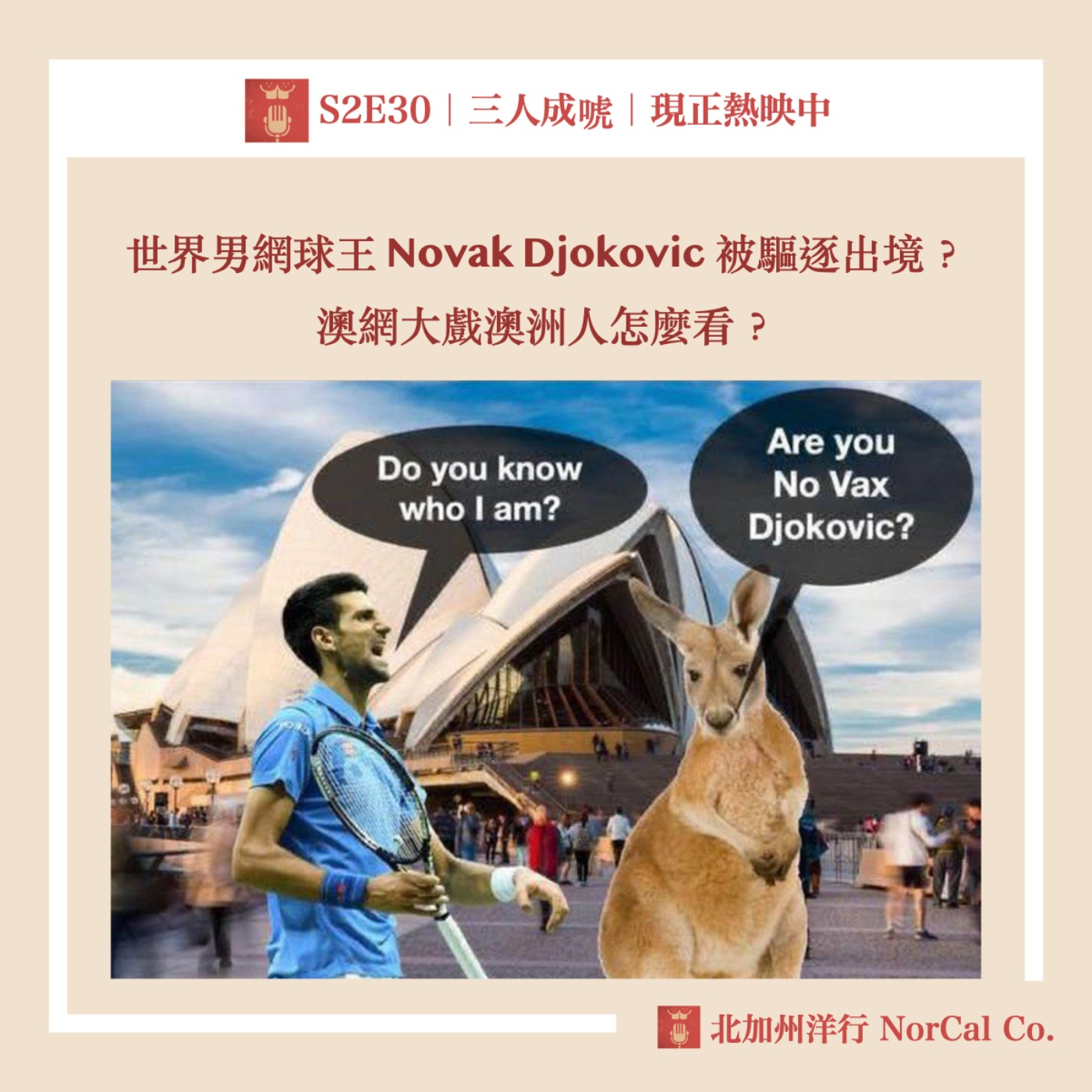 #三人成唬時事微知識單元 澳洲🇦🇺網球公開賽🎾即將在下週一 1/17 開打,在參賽者陸續抵達墨爾本準備之際,發生了戲劇化的事件 — 男網世界排名第一🥇的 Novak Djokovic(以下使用台灣鄉民對他的暱稱「囧口」)在飛到墨爾本機場之後,被澳洲拒絕入境▶帶進海關小房間▶取消簽證▶送到移民拘留所旅館住了好幾天,究竟為什麼世界球王會在澳洲發生這些抓馬?來賓安妮從澳洲過去兩年的防疫政策和澳洲人文化特質,帶我們了解囧口事件!