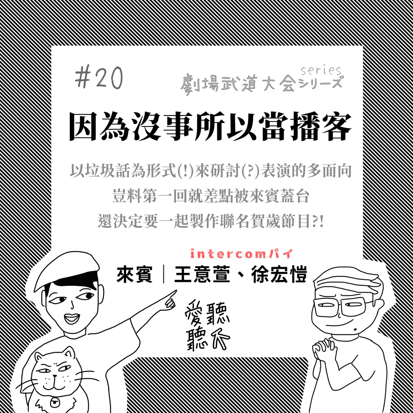 『劇場武道大會series』,新系列主題登場,以垃圾話形式(!!)來研討研討表演的各種形狀,未料首波放送,差點就被來賓蓋台!與友台「interomパイ音特乾杯」意萱&徐勞闆,共同擴大垃圾話規模,該講的,不該講的,通通在本集講好講滿。